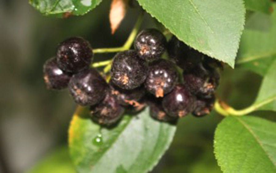 Chokeberry (Aronia melanocarpa) grows in full to part sun in all soils and will reach 2.5m high and 1m wide. It can sucker so is best planted as a hedge or in a group.