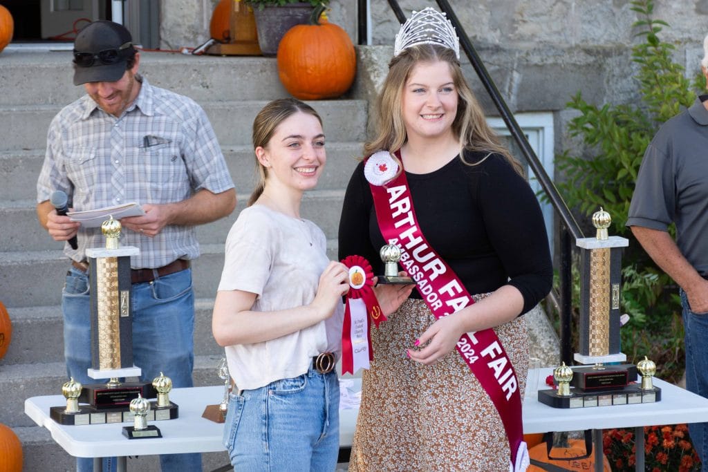 Ribbons were awarded for the largest pumpkins and zucchinis at the Metz Pumpkin Fest on Sept. 30. Arthur Fall Fair ambassador Kaitlin Gorman poses for a photo with Kate Haid, winner of the teen class with a 25-pound pumpkin. Photo by Jordan Snobelen