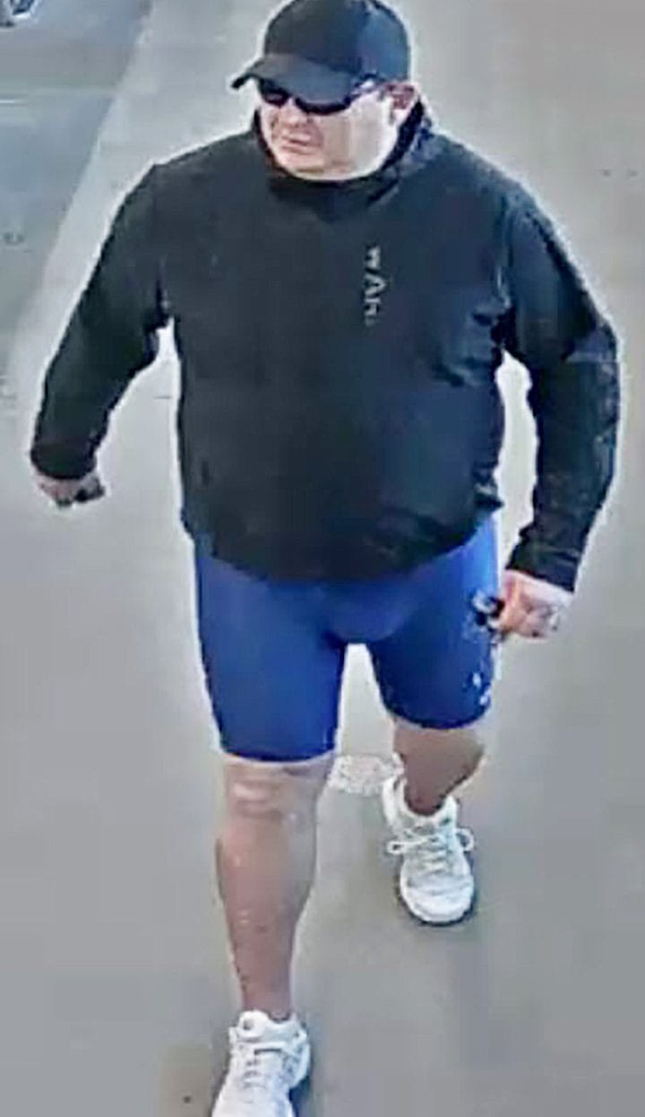Police say he was wearing a dark baseball cap, dark sunglasses, dark hoody, blue spandex shorts and white sneakers, and was carrying keys and a black wallet.