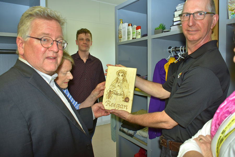 Senator Rob Black, left, and Mapleton Mayor Gregg Davidson, right, display some artwork that Reegan Gordon, middle, completed while in his residency. Photo by Bill Longshaw