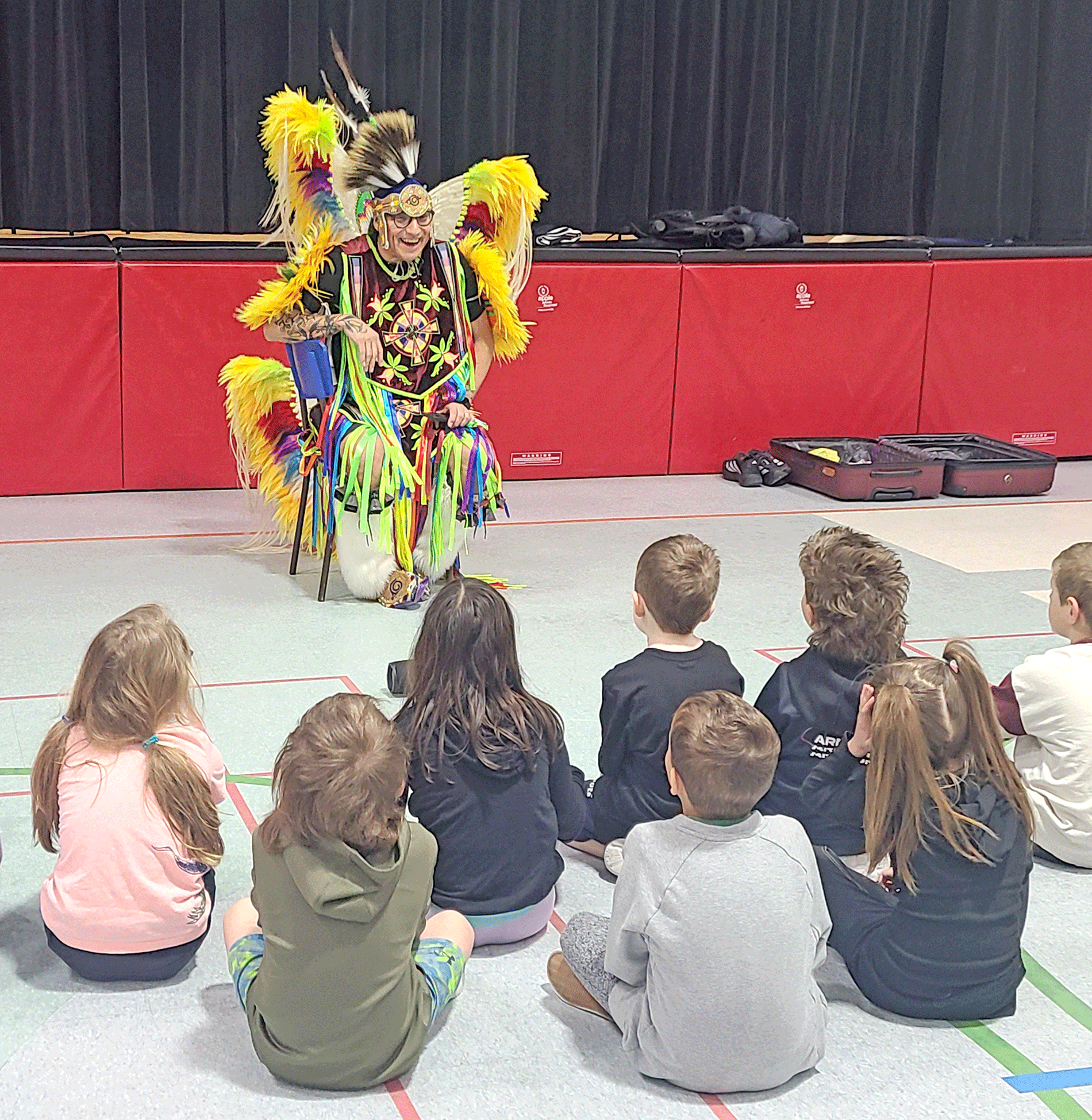 Power of dance – Ojibwe and Blackfoot dancer Classic Roots, or Joshua DePerry, engaged students at Palmerston Public School on April 17 while he explained his regalia and then danced for the students. His costume is colourful and lively, especially when he spins and twirls and the students seemed engrossed by his words and movement. The students also got a chance to try powwow dancing. It was one of 10 stops on DePerry’s Classic Roots tour at Upper Grand District School Board schools last week. Photo by Robin George