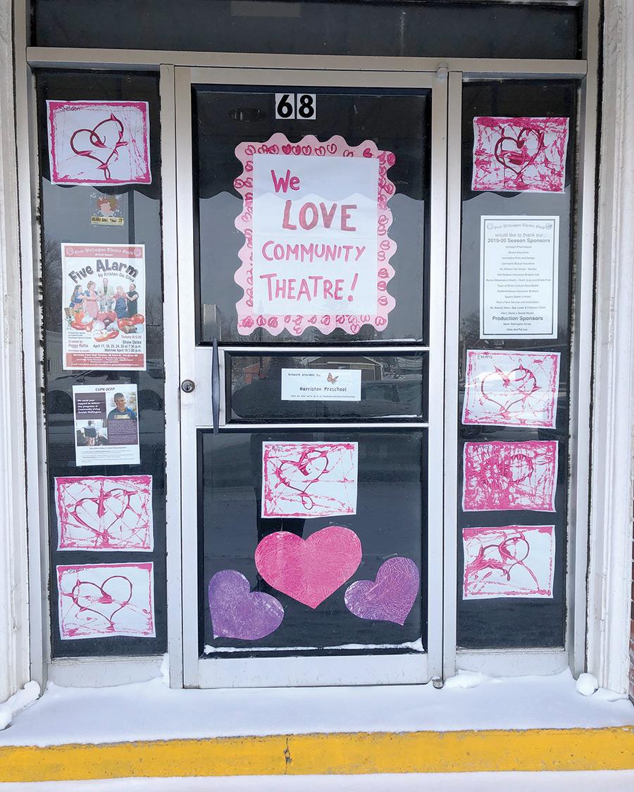 Community support – The doors at the Harriston Town Hall Theatre may not be open to the public these days due to provincial restrictions related to the COVID-19 pandemic, but the front door is currently decorated with a show of support for the Grey Wellington Theatre Guild in the form of artwork from Harriston Preschool students.