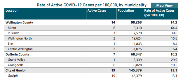 Active cases in Guelph have declined to 19 and Dufferin County has seven active cases.