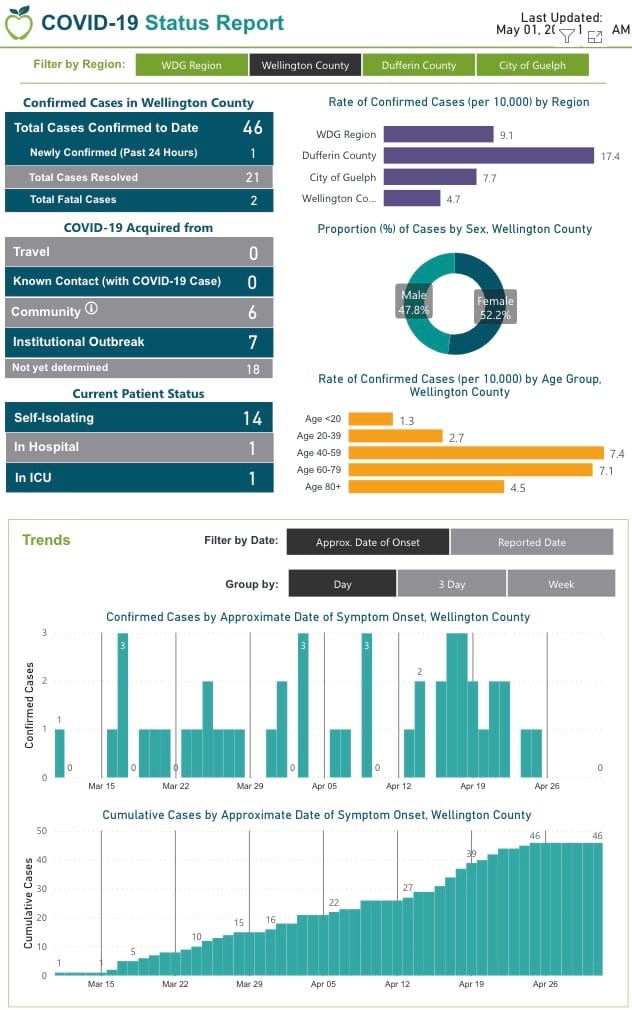 - Wellington County has 46 cases, 21 resolved cases and two deaths;