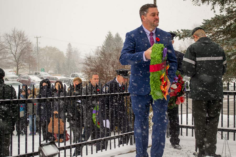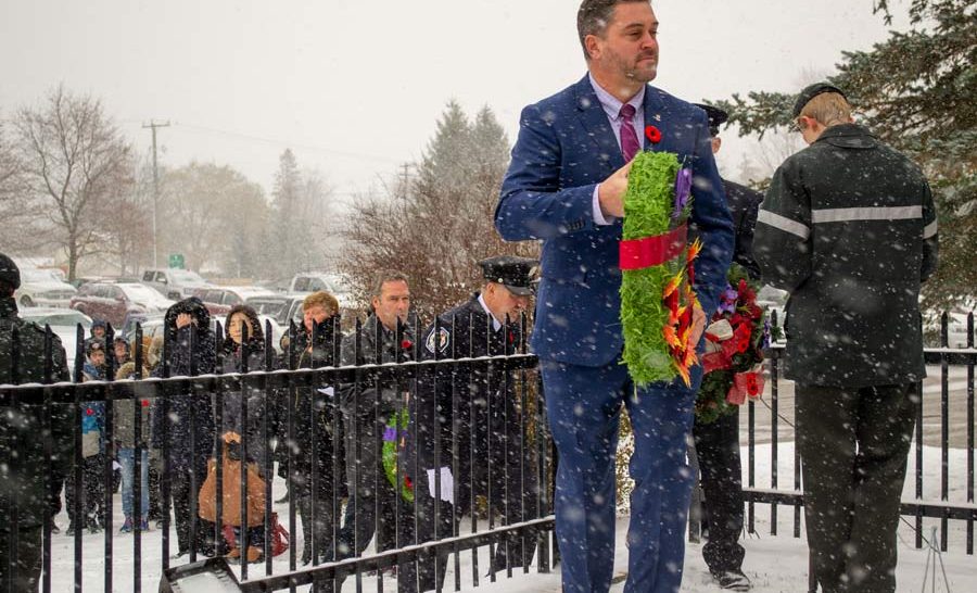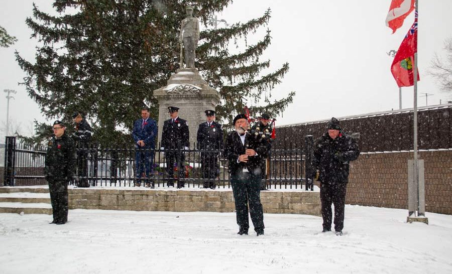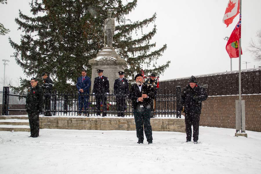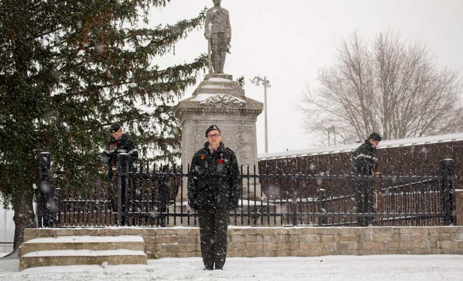 Honouring the fallen – The snowy weather didn’t stop the Remembrance Day service at the Aberfoyle cenotaph and Puslinch Community Centre on Nov. 11. Cadets stood as the honour guard at the cenotaph. The Remembrance Day service was offered through the Puslinch Optimist Club, the Puslinch Ministerial and the Township of Puslinch.