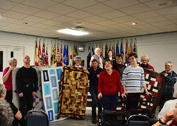 Members of the Grand Quilt Guild gathered at the Fergus Legion on Jan. 9 for their regular meeting and to present The Lighthouse Group Home with eight quilted blankets and place mats for residents. The home just outside Fergus has eight special needs residents and is part of the Canadian Reformed Association for the Handicapped, which has five homes in Ontario. Nancy Boon organized the donation of the quilts, which were all made by guild members. Photo by Bill Longshaw
