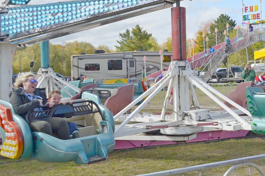 Parents and kids enjoying the acceleration provided by the Sizzler ride at the Erin Fall Fair. With good weather and a new entertainment strategy, the fair set a record with attendance of 26,175 people from Oct. 10 to 14 and Erin Agricultural Society (EAS) president Rod Perry said that was more than 15 per cent higher than the previous record set in 2017, and a big improvement on the attendance of 18,000 in 2018. He said there were many positive comments on the new Festival Gardens, a combined beer tent and musical venue that drew an estimated 3,000 visitors. Overall revenue was up 25% compared to the previous high in 2017. EAS has a survey, available at erinfair.com, for feedback on this year’s fair and suggestions for next year. Photo by Phil Gravelle