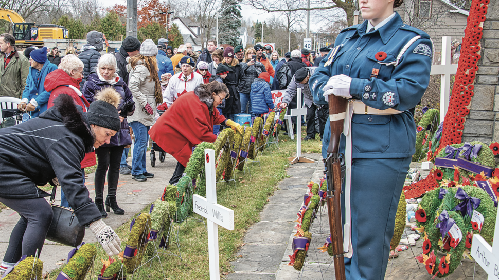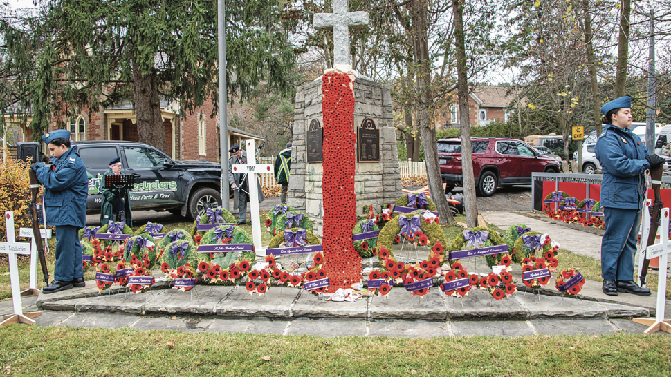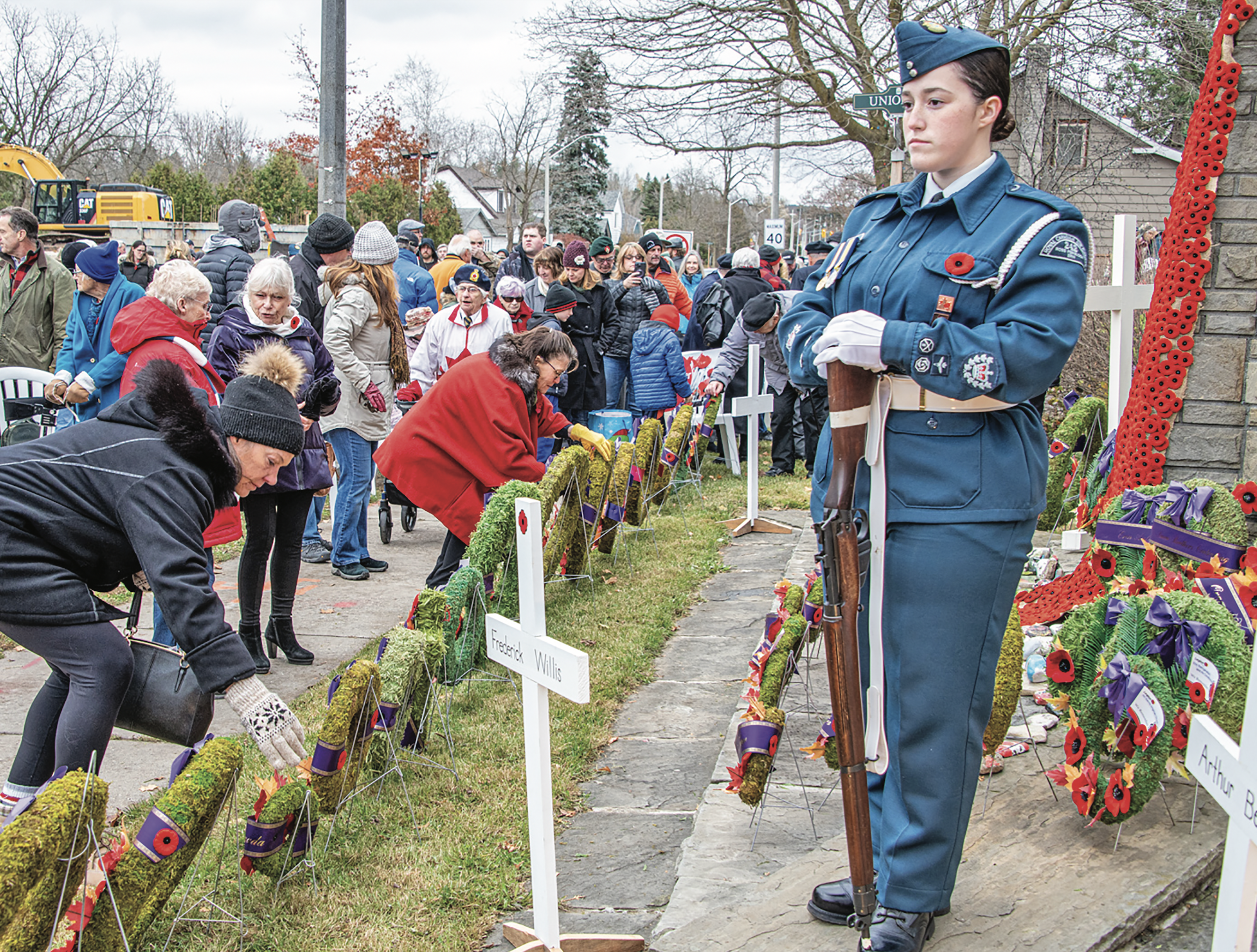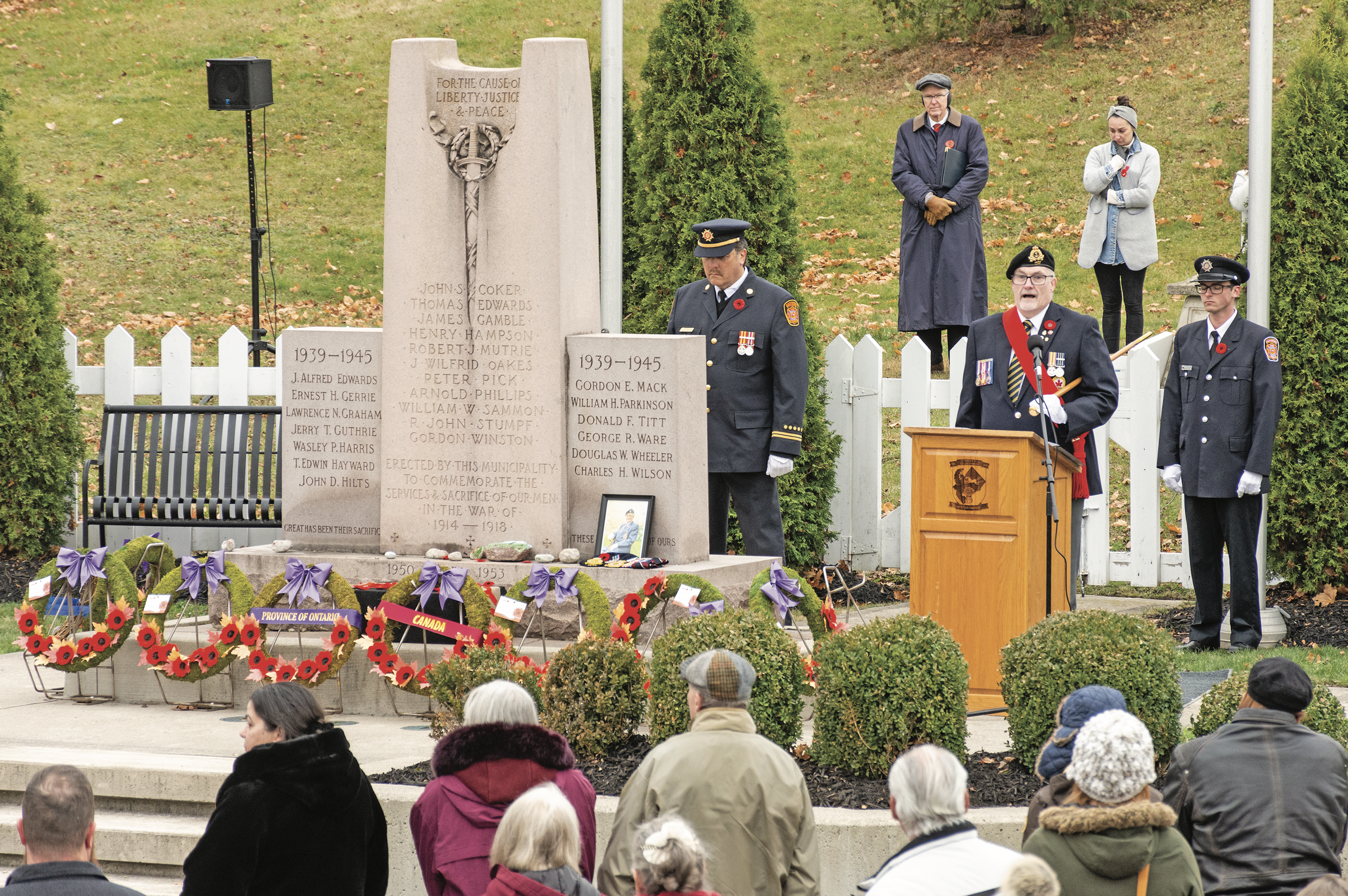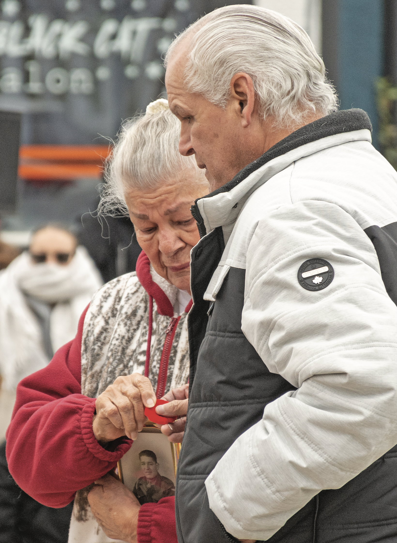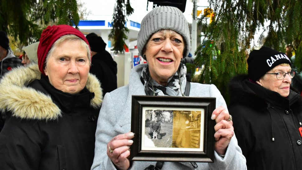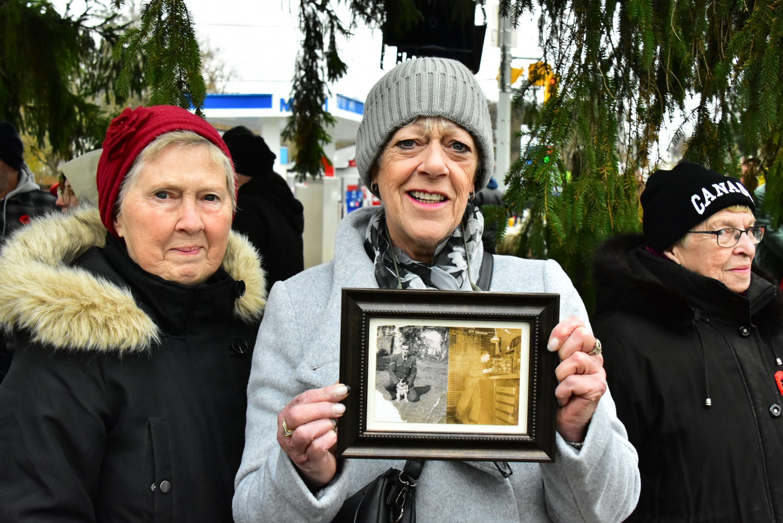 On Remembrance Day in Fergus, Shelley Altman, right, with friend Laurie Gracey, left, brought a photo of her late father-in-law Robert Altman, who served in the Second World War. He was in Squadron 429, and served as a mechanic until turning 43 years old. He came from Poland and served in the Canadian Army. Shelly said he will always remain in her prayers, and she lightes a candle for him each year on Nov. 11. Photo by Bill Longshaw