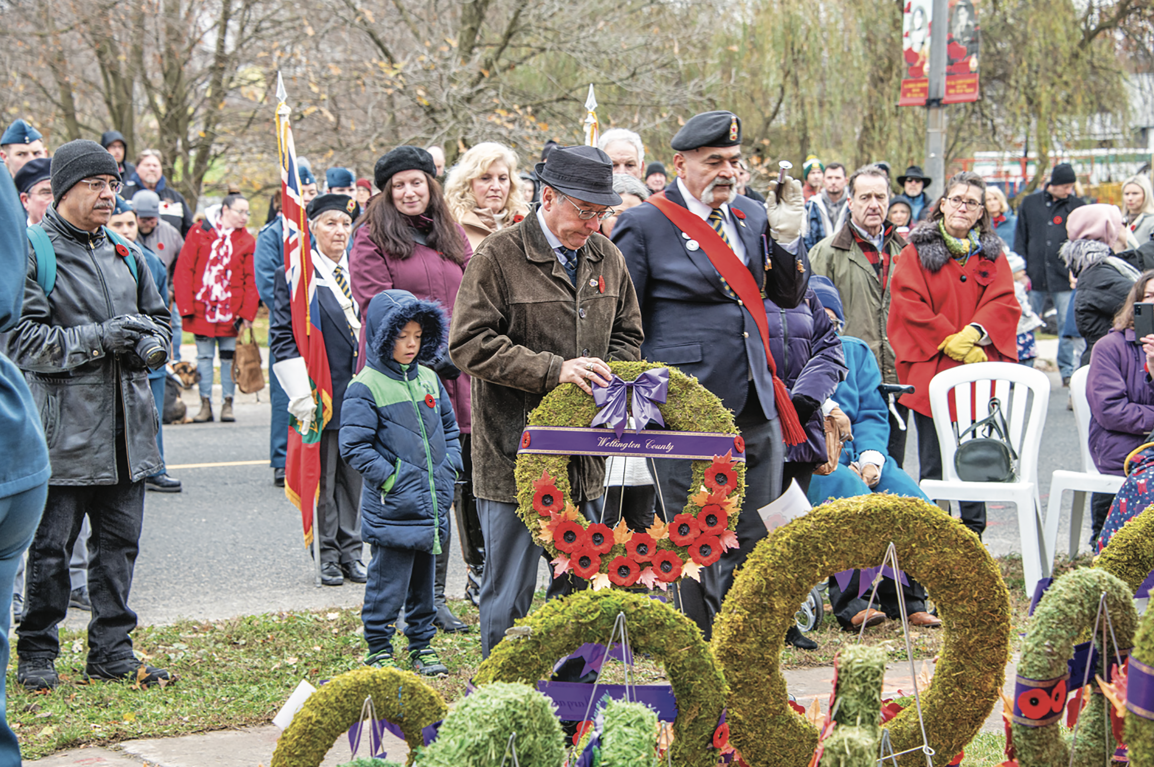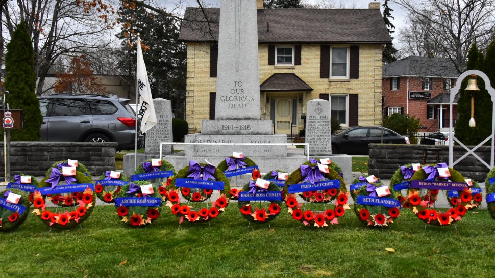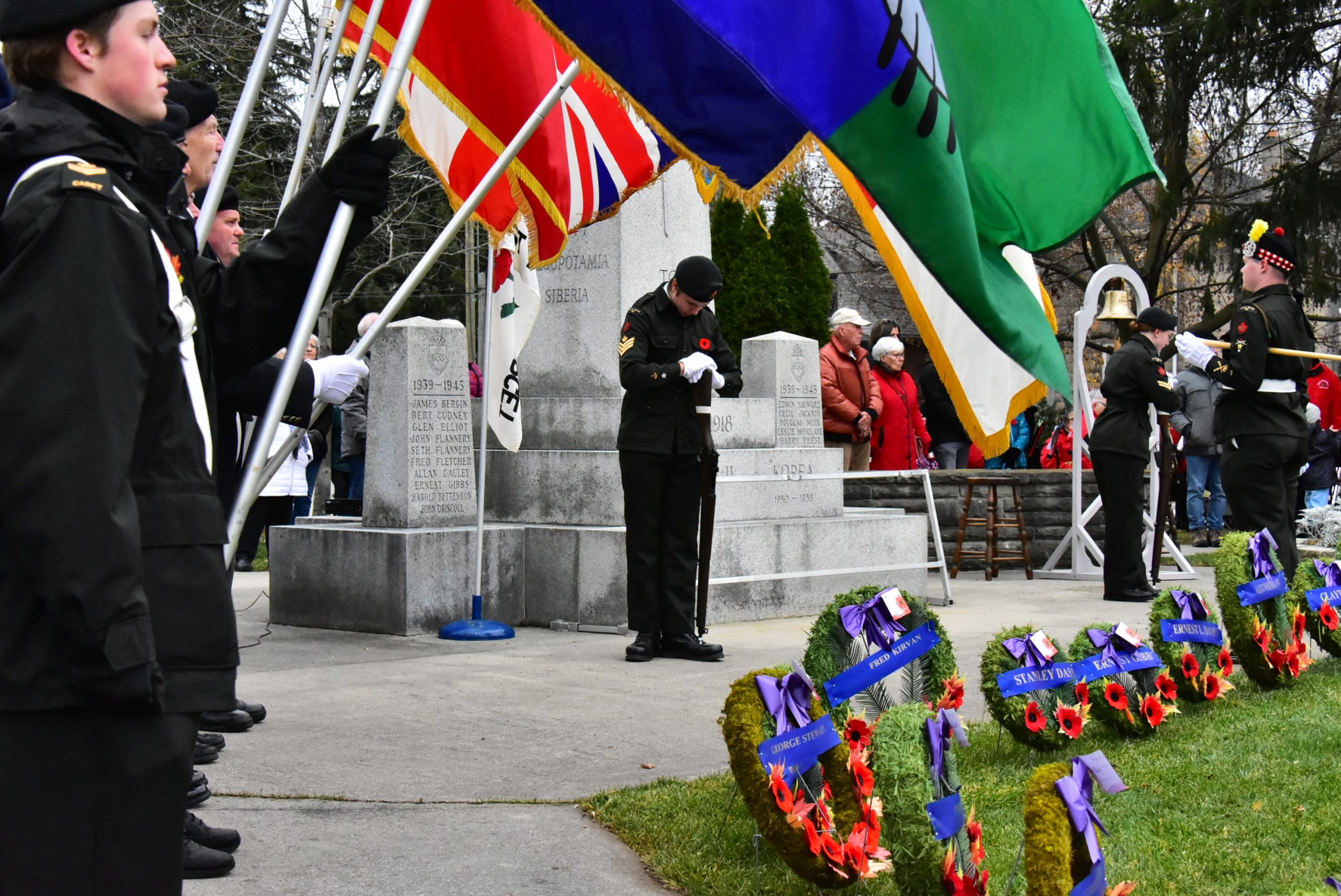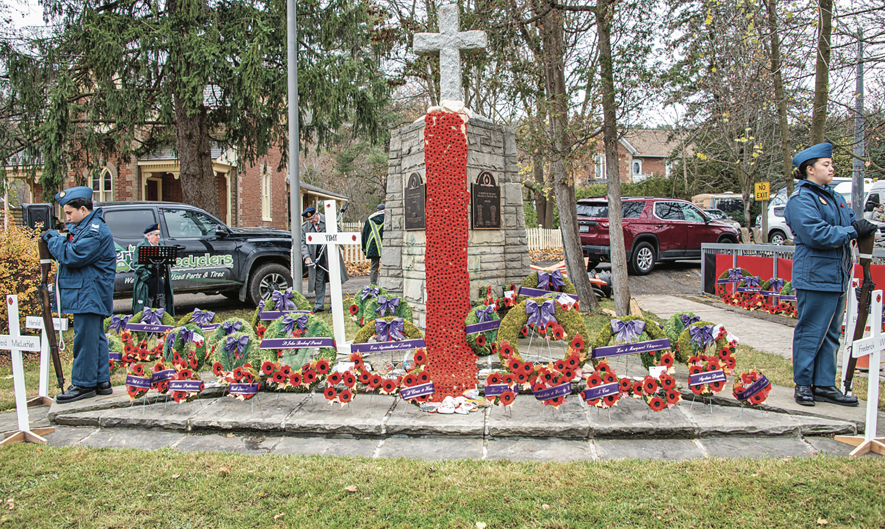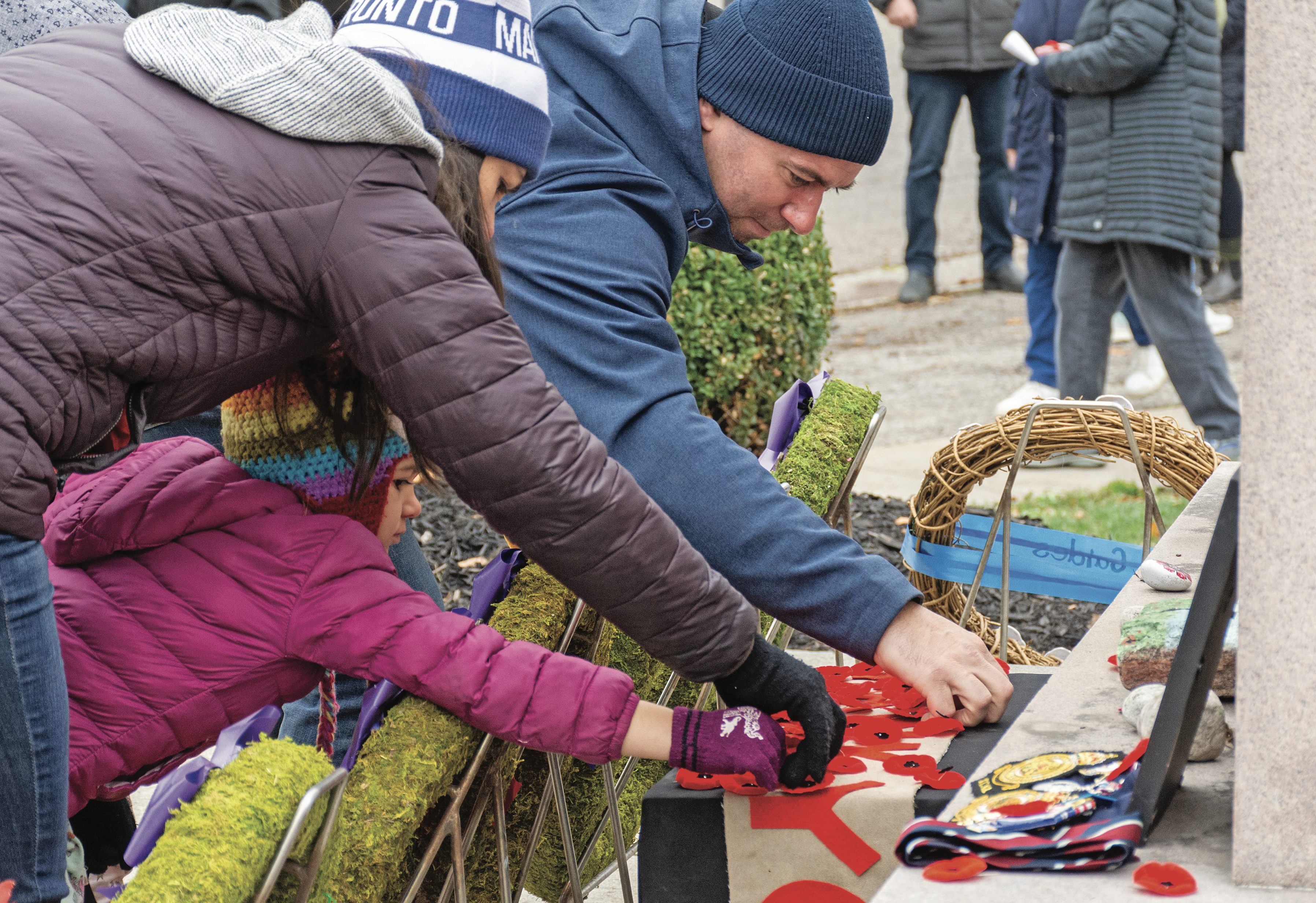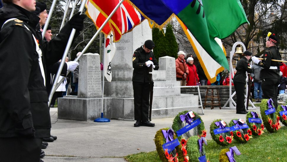 On Remembrance Day in Fergus, Shelley Altman, right, with friend Laurie Gracey, left, brought a photo of her late father-in-law Robert Altman, who served in the Second World War. He was in Squadron 429, and served as a mechanic until turning 43 years old. He came from Poland and served in the Canadian Army. Shelly said he will always remain in her prayers, and she lightes a candle for him each year on Nov. 11. Photo by Bill Longshaw