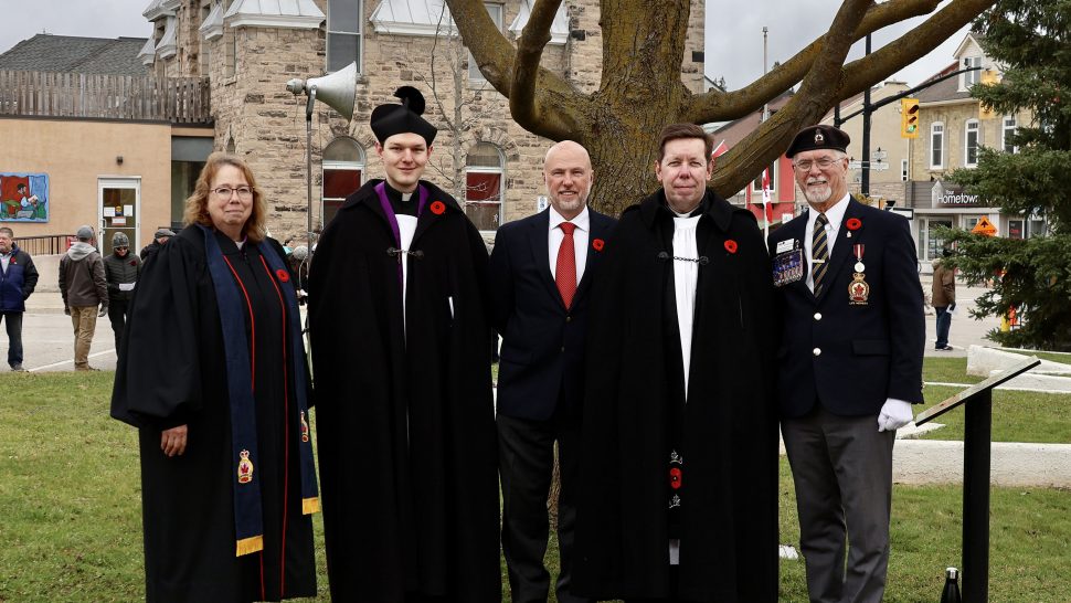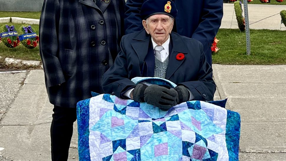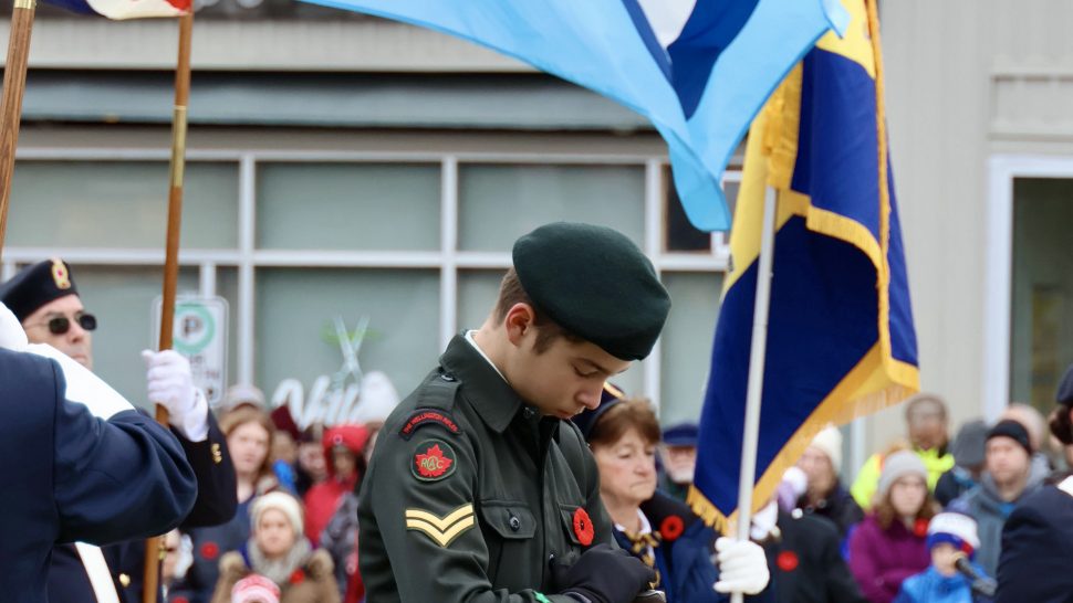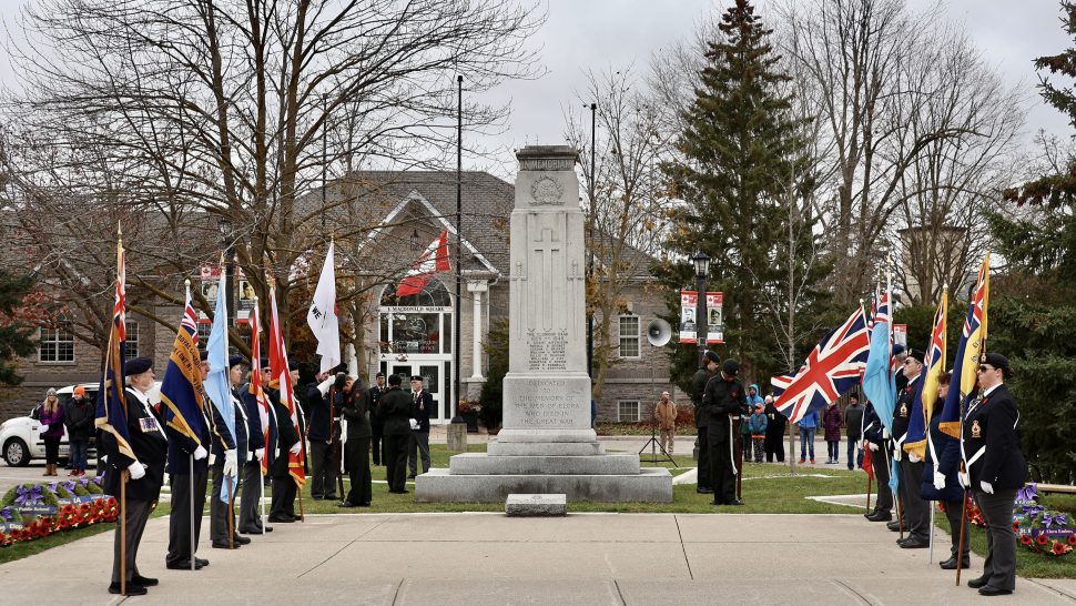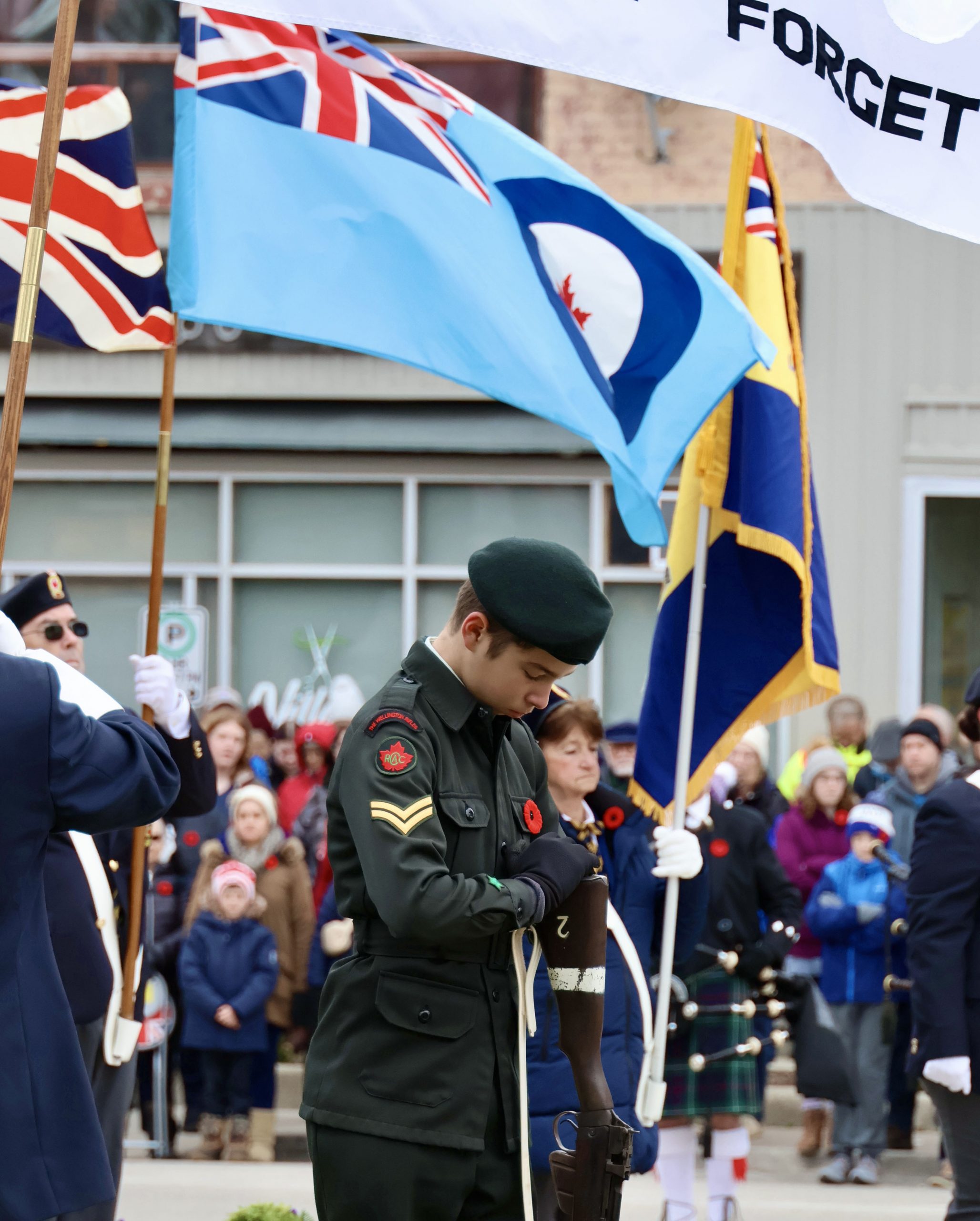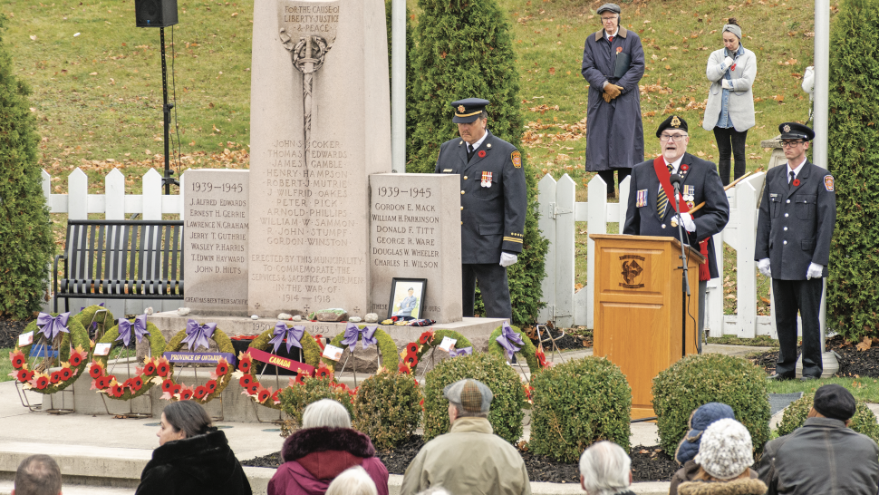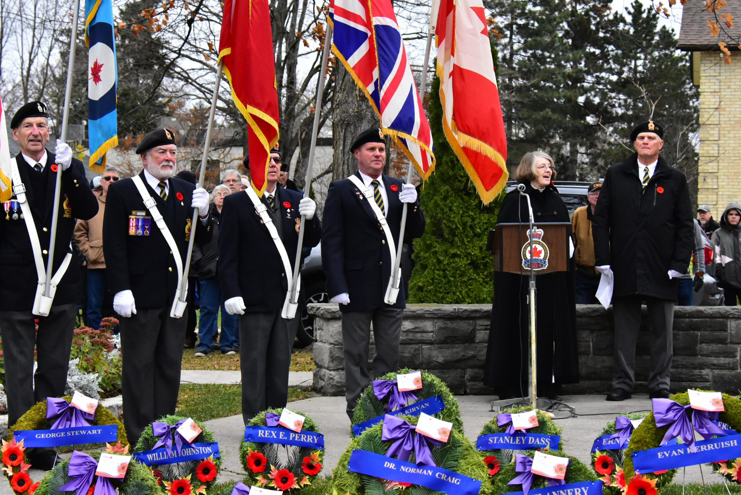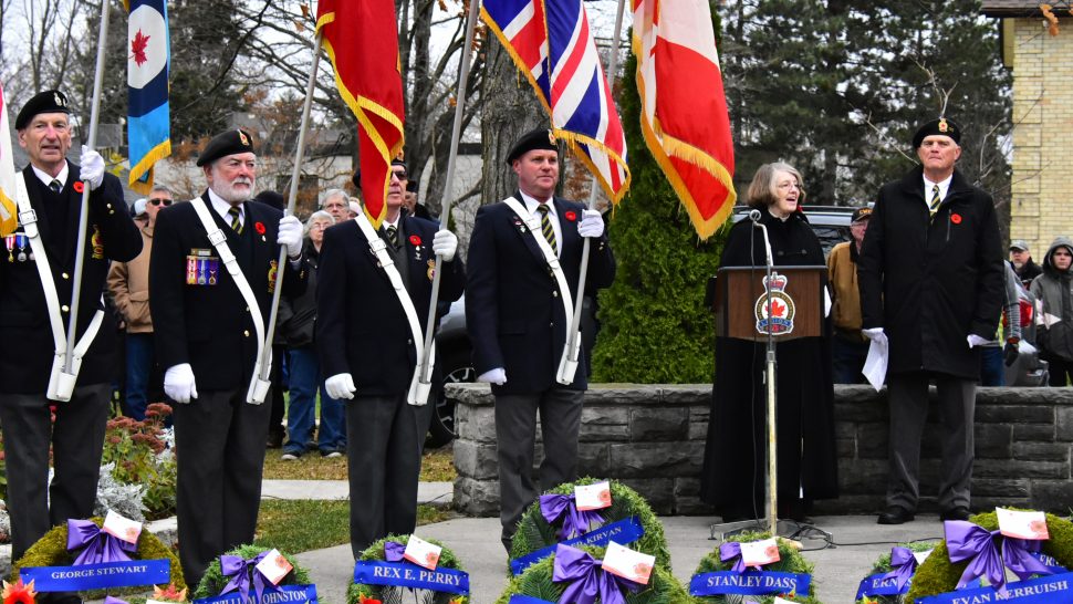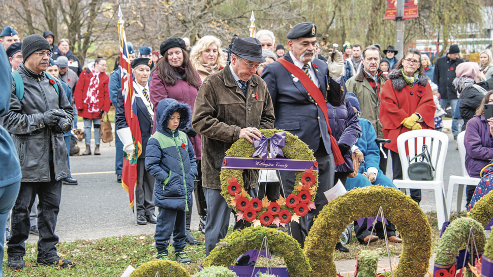 On Remembrance Day in Fergus, Shelley Altman, right, with friend Laurie Gracey, left, brought a photo of her late father-in-law Robert Altman, who served in the Second World War. He was in Squadron 429, and served as a mechanic until turning 43 years old. He came from Poland and served in the Canadian Army. Shelly said he will always remain in her prayers, and she lightes a candle for him each year on Nov. 11. Photo by Bill Longshaw