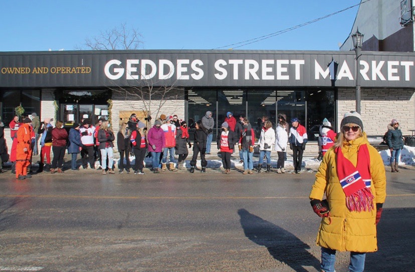Leslie Stewart organized the tribute to recognize Merlen Kropf as his family drove his remains from the funeral home to the cemetery following a private service. She wore Merlen’s Montreal Canadiens scarf in tribute.