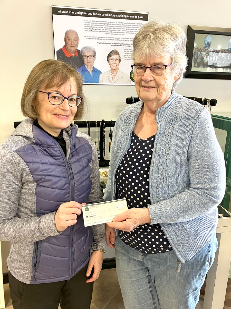 Ribfest donation – Christine Rivet, left, of Git Yer Hillbilly On Ribfest, presents a cheque for $500 to Cancer Patient Services president Rosemary Tanner. The Mount Forest Ribfest has raised more than $12,000 for local health care and minor sports through the years. The annual event, which returns on July 13, honours the memory of local volunteer Bill Walker who died of cancer in 2017.