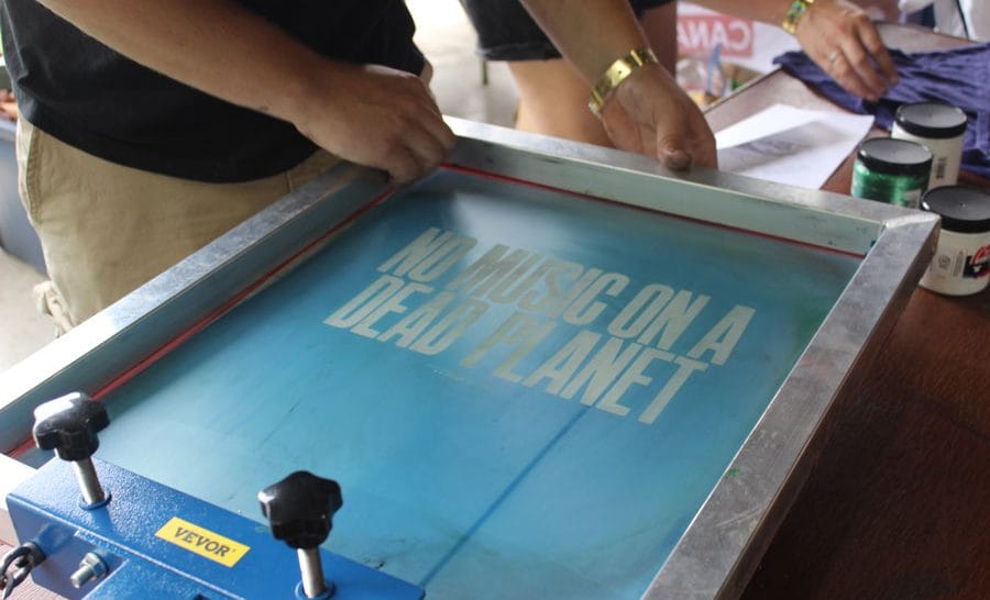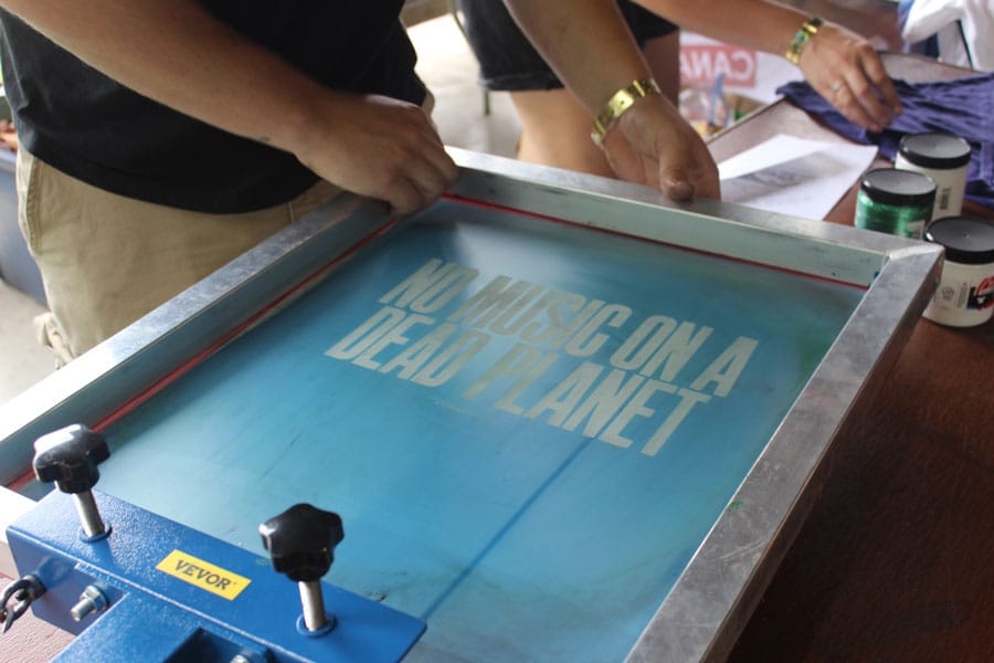 Volunteers from Music Declares Emergency brought a print screen to make t-shirts with the words “No Music on a Dead Planet.”