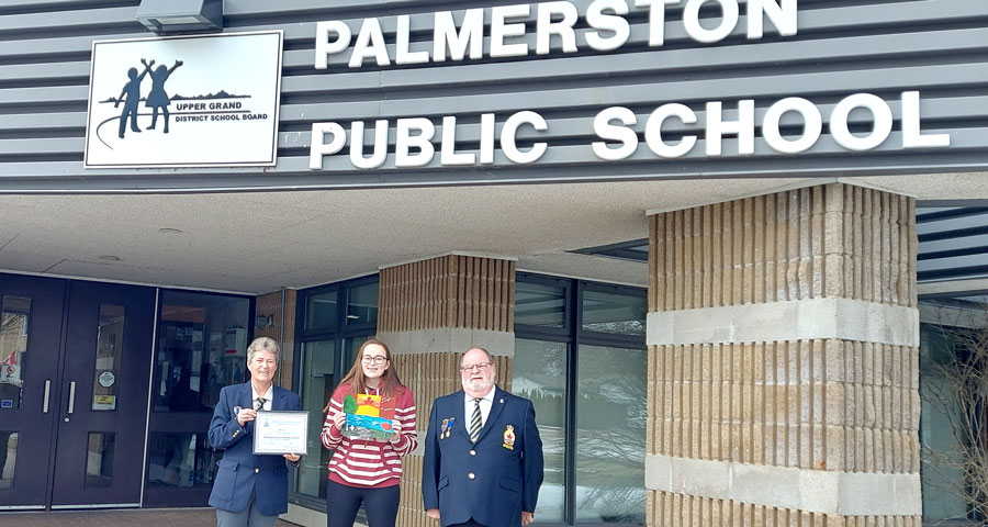 Poster winner – Palmerston Public School student Callie Cole won first place at both branch and zone levels in the Royal Canadian Legion Poster and Literacy Competition for her entry in the Intermediate Colour Poster category. She also placed second at the district level with her poster. Gayle Blackwell, Palmerston Legion youth and education coordinator, left, and branch president Allan Toner recently presented her with a certificate marking the accomplishments.