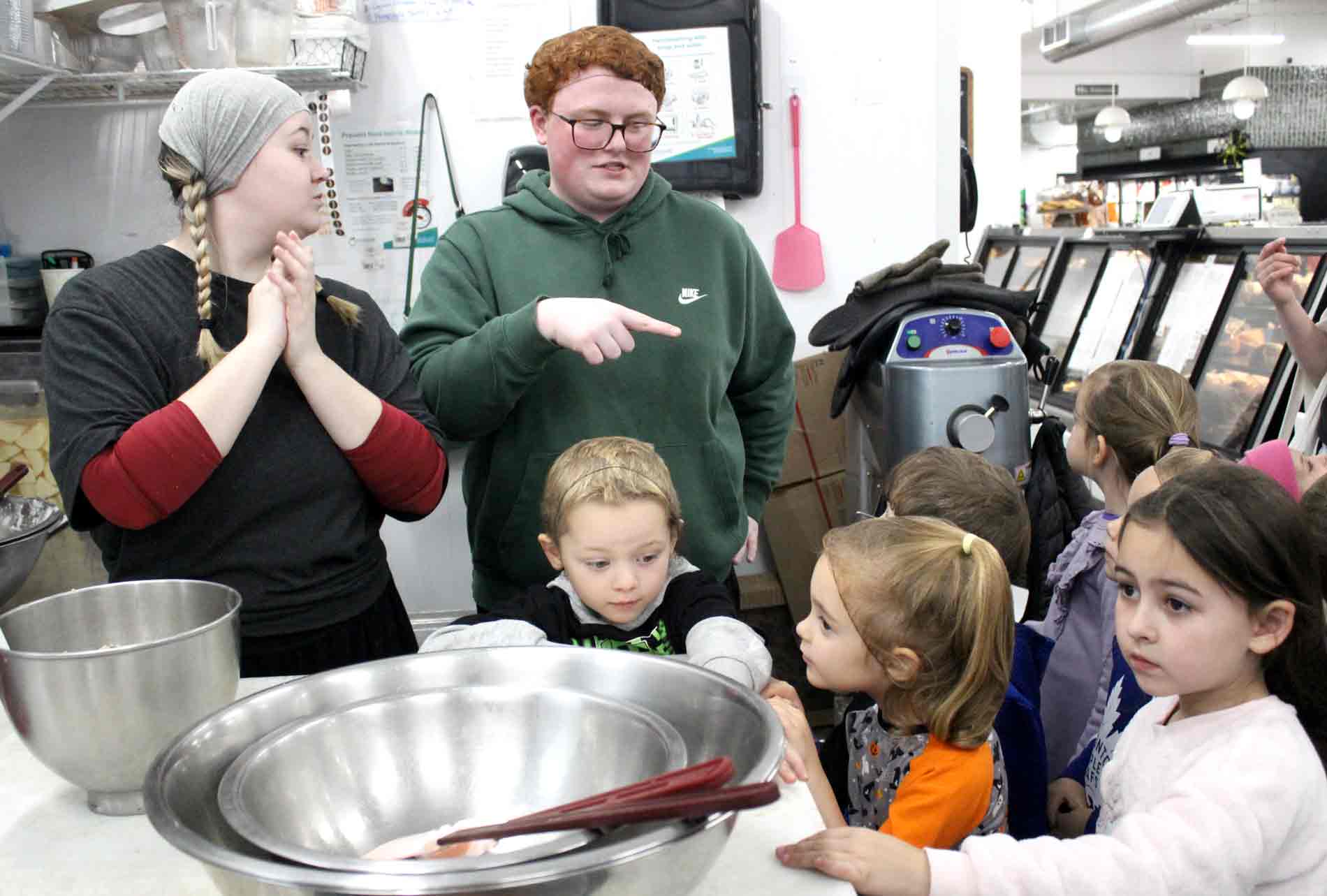 Bakery worker Karter Patterson, once a student in Heffernan’s kindergarten class, said the visit going so smoothly was a testament to Heffernan, but the teacher noted “The bakers were so prepared and helpful which was key in the smoothness.” The students here, from left, are Nixon Cordes, Maxine DeBoer and Evelyn Walpole. Businesses interested in inviting the kindergarten students to their kitchens, or visiting the school to connect learning and local food, can email Heffernan at theffernan@ugcloud.ca.