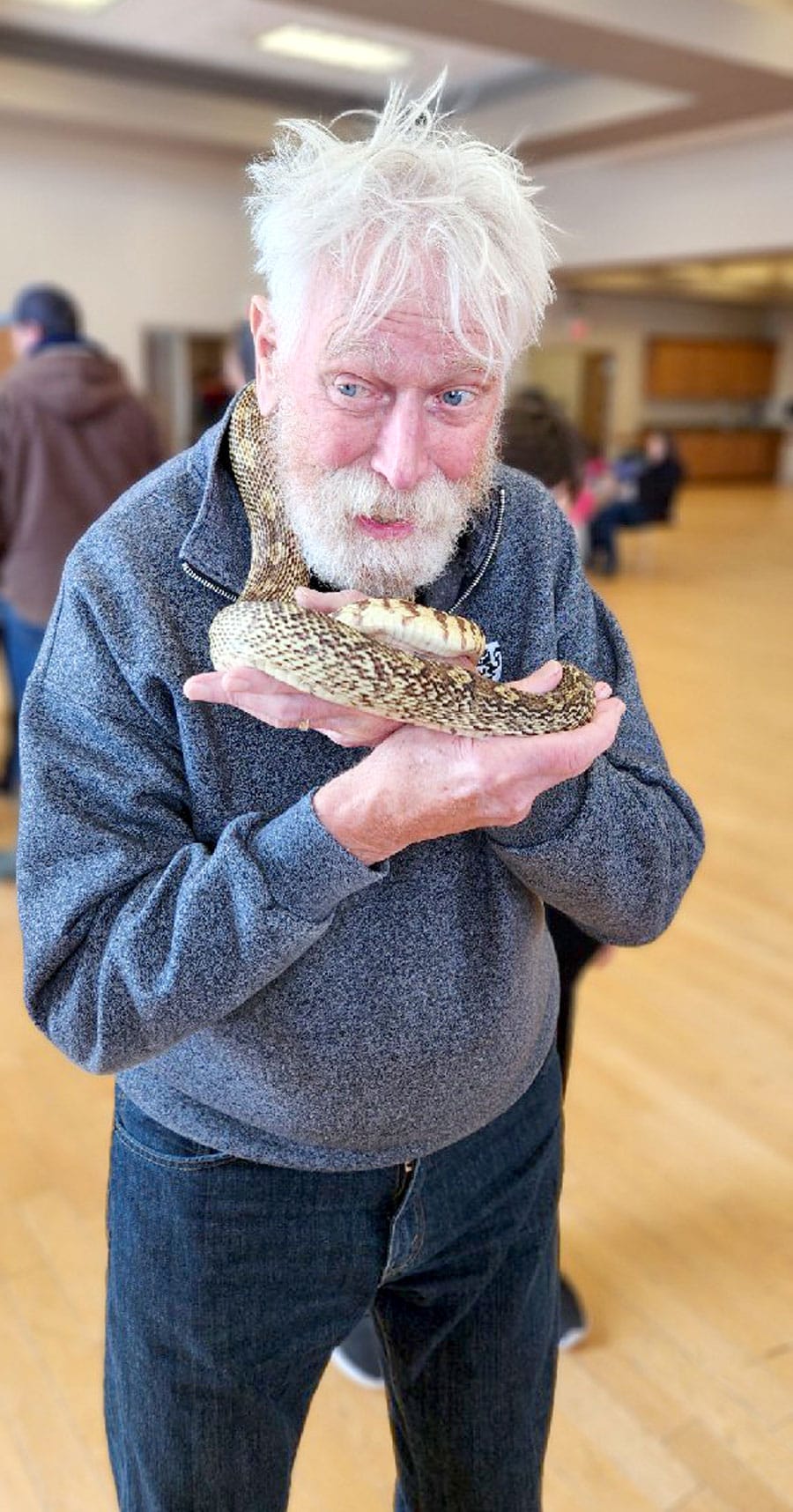 Among those checking out the serpents at the event, hosted by the Optimist Club of Alma were Mapleton Mayor Gregg Davidson with “reptile ambassador” Jenny Pearce of Sciencsational Sssnakes and Optimist member Jim deBock.