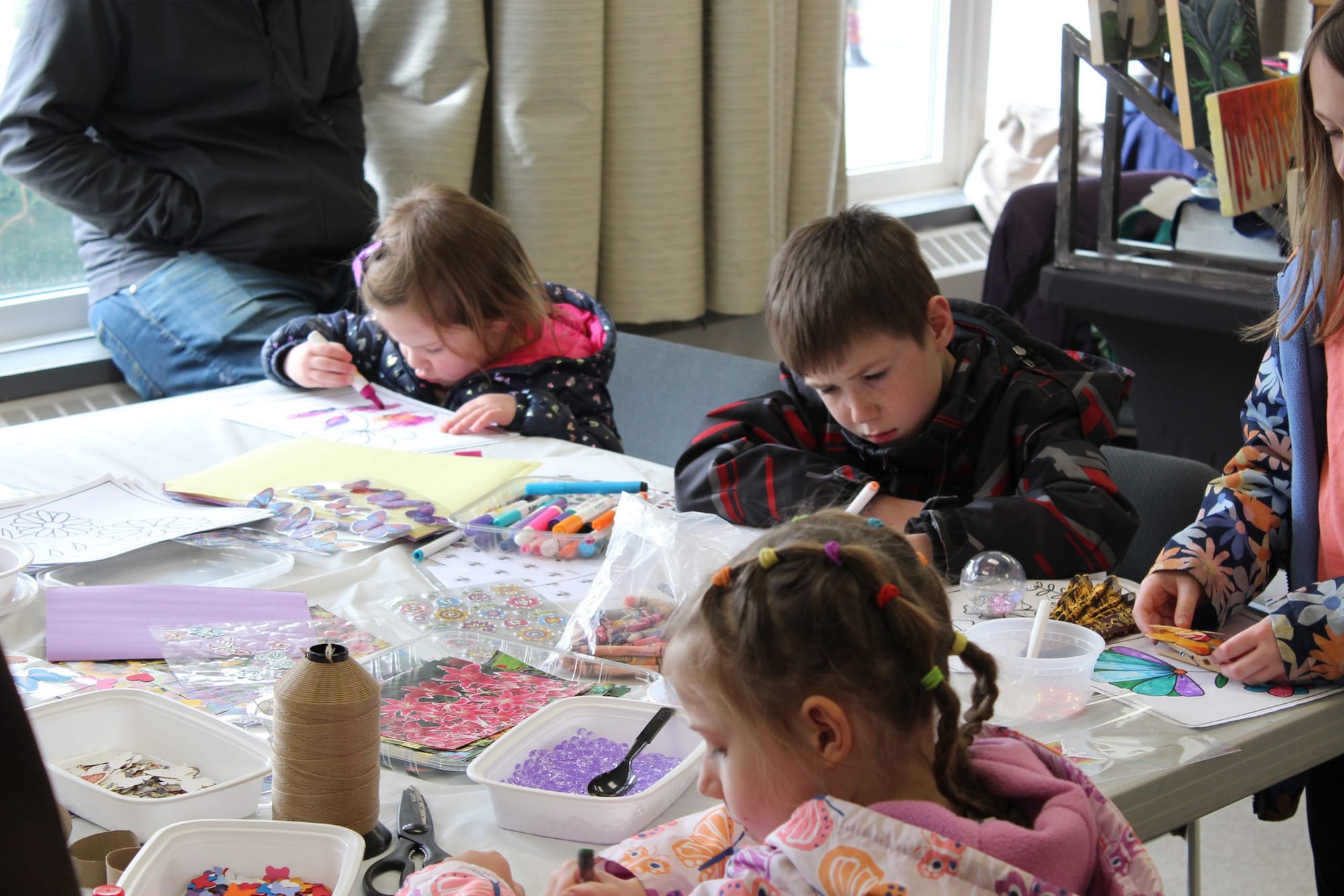 Crafts – While parents and guardians took a look at garden-related booths, a kids craft table was set up in the corner to entertain children who attended.Fiona Mason and Claude Lacroix have fun welcoming people into the CW Seedy Saturday event.