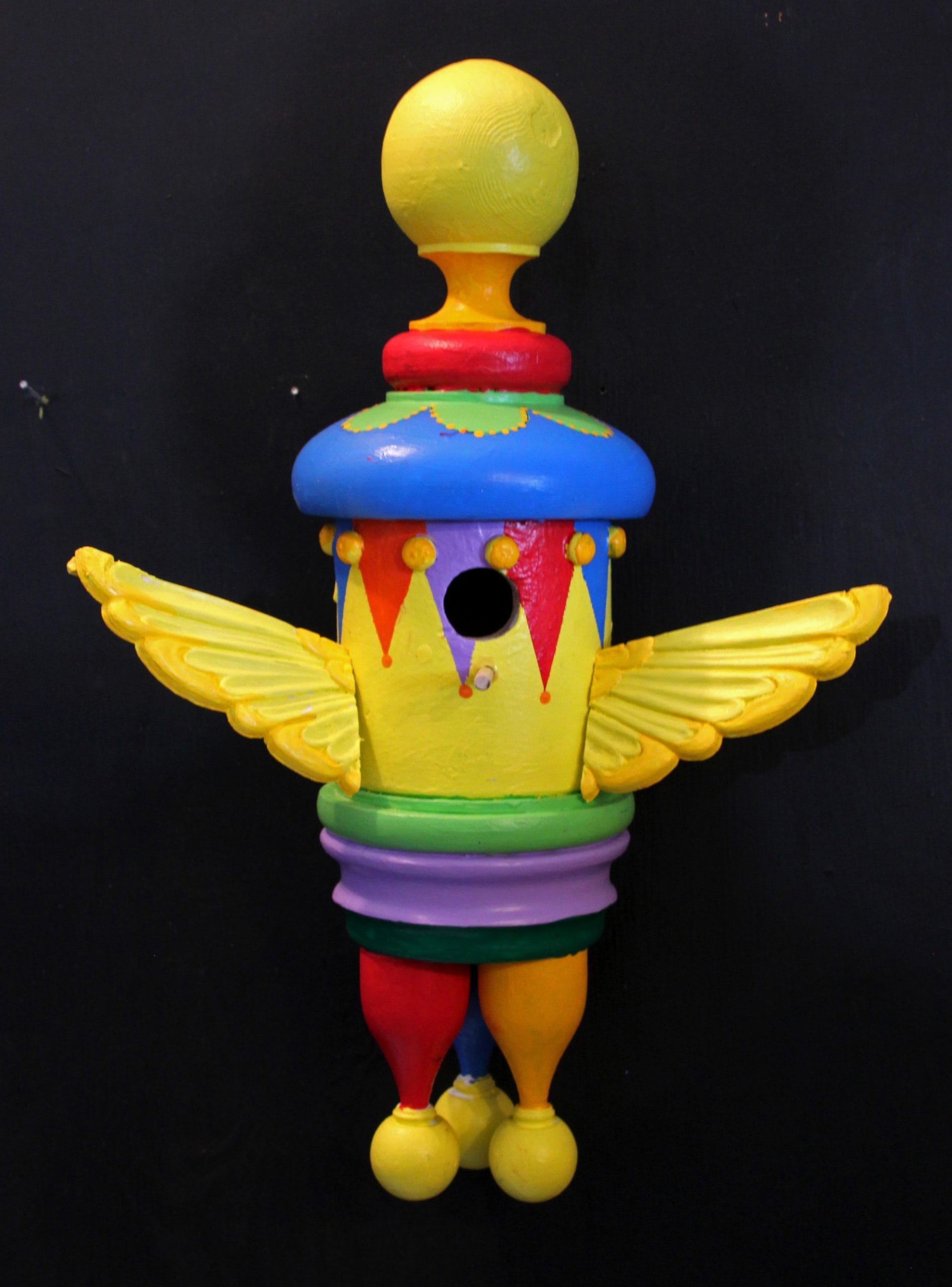 “I wasn’t that interested and thought of a lot of other things that they had. But then I started to sort of think about things like, chess pieces and spoon racks and all sorts of things that would be interesting to make things with. And so that’s when I started making bird houses, the sort of compilation of some of those sorts of things. And that really got me going with going back to sort of making things like I used to when I was little, hammering pieces of wood together, glue pieces of wood together, painting them bright colors.”