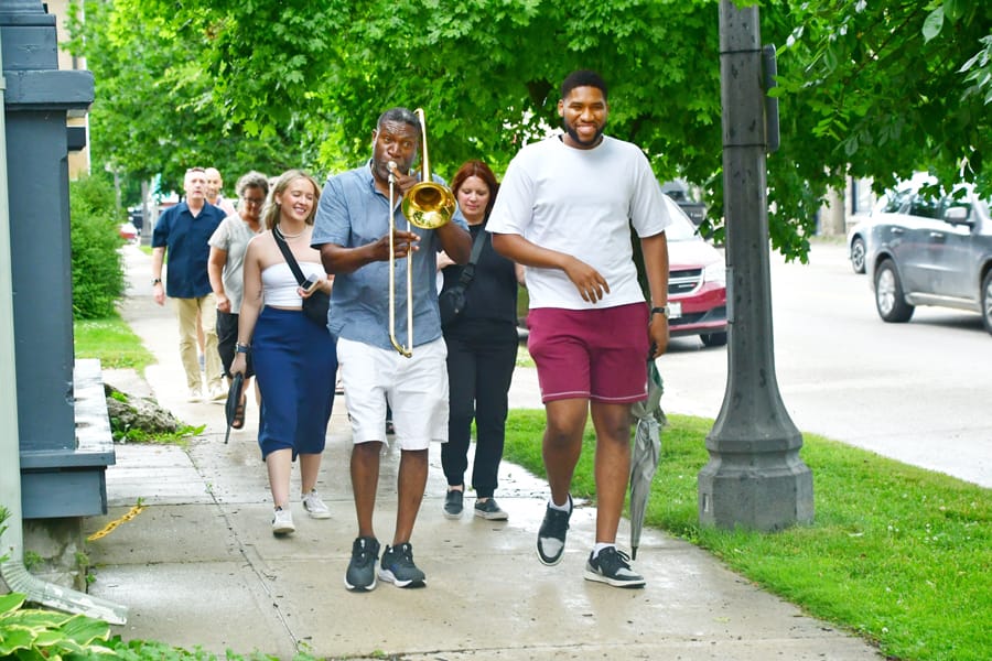Trombonist Mike Smith leads one group to their next dining spot.