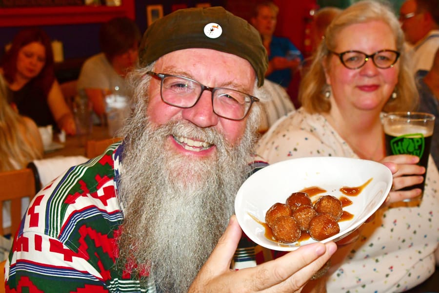 Gary Faris from Fergus, participated in Pub Night. Here he shows a dessert of sugar tossed doughnut rolls which he is about to devour at the Goofie Newfie.