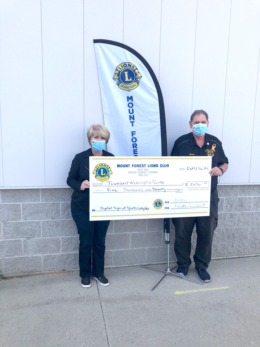 Sign contribution - Mount Forest Lions Club president Marty Young presented Wellington North councillor Sherry Burke with a cheque for $5,070 towards the construction of the digital sign at the corner of Cork and Queen streets. This is the second payment in a three-year commitment toward the cost of the sign. The township manages the posting of relevant community information - a great source for events happening in the area, Lions officials note. Submitted photo