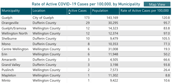 - Guelph: 52 new cases, 173 active cases and eight in hospital.