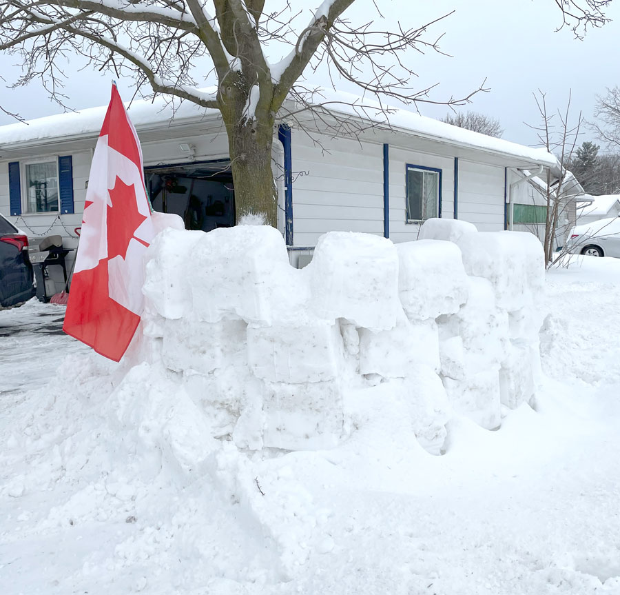 Winter fun – Mike Ferguson of Harriston and some weekend visitors decided to take advantage of the recent snowfall to have some fun creating an impressive snow fort. The construction crew packed recycling blue boxes with snow to create the blocks. From left: front Hadley Blair and Kohlten Kelly; back, Ferguson and Kevin Bair.