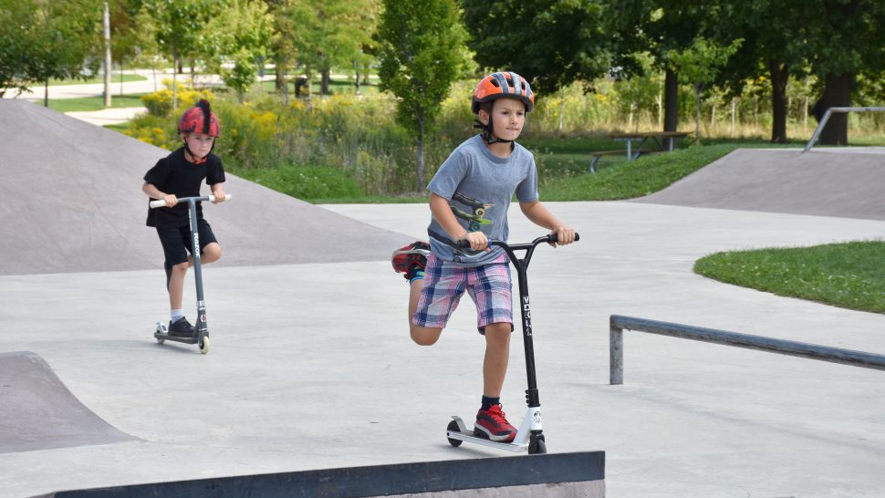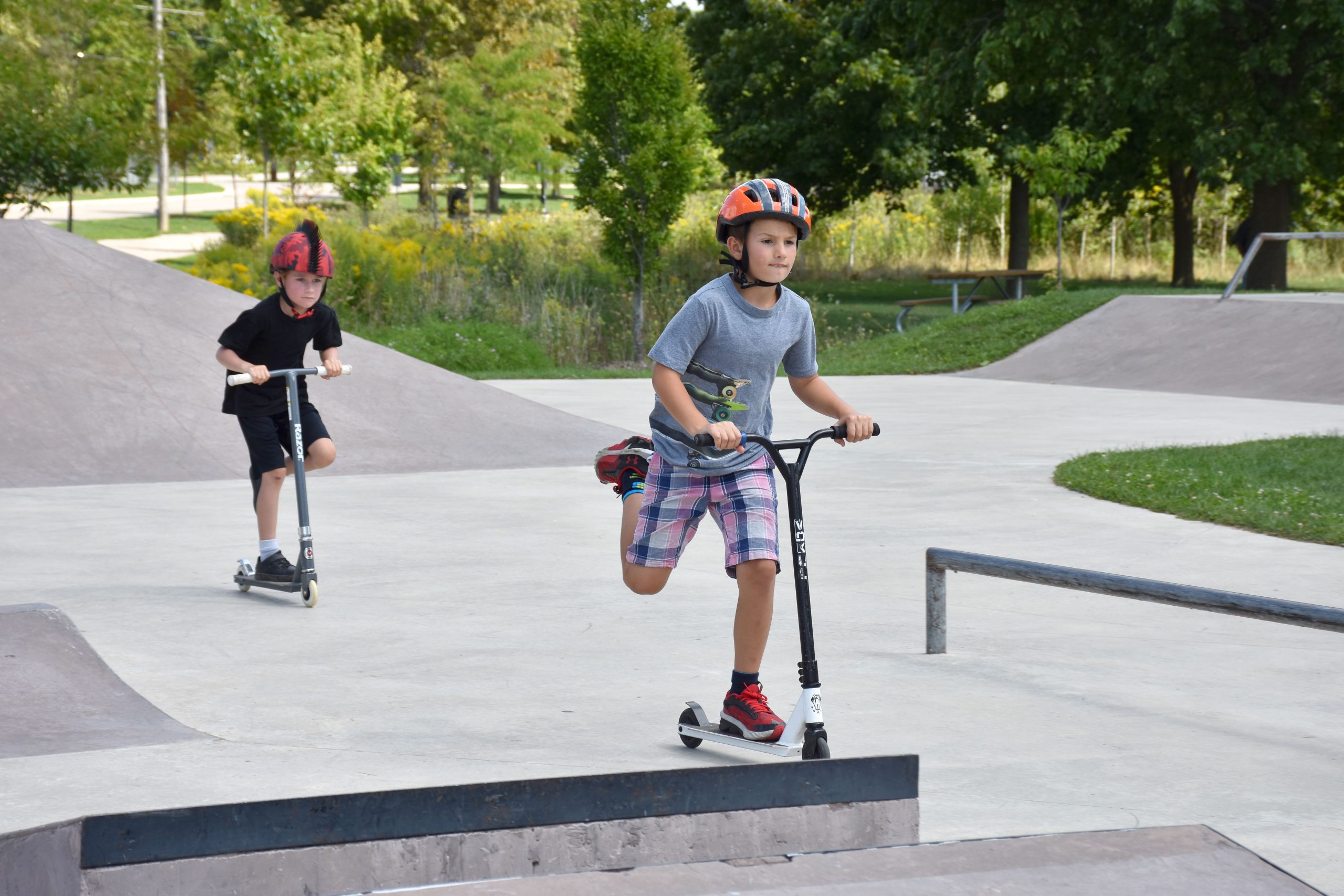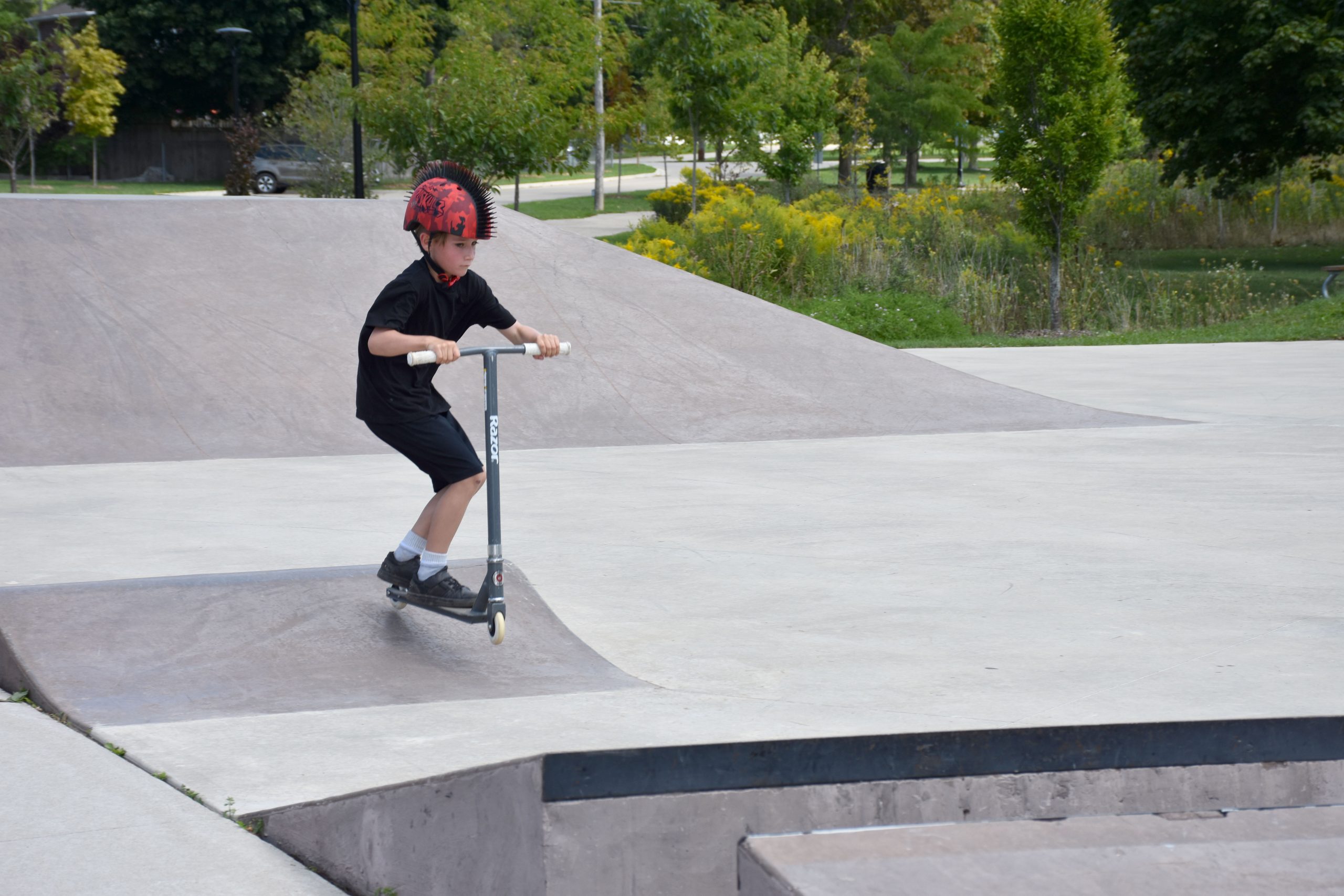 LEFT: Lee Abram hit jumps on his scooter at the skatepark on Sept. 3.