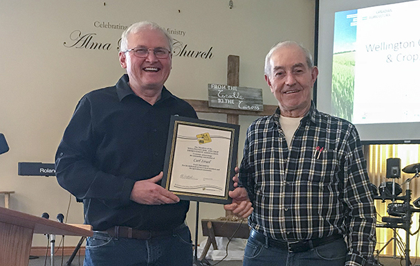 Award – At the end of November Carl Israel, right, received an appreciation certificate from Wellington County Soil and Crop Improvement Association at its annual general meeting. Israel was president of the association from 2014 to 2017 and sometime in the 1970s. Vice-president of the Ontario Soil and Crop Improvement Association Stuart Wright, left, was on hand to make the presentation. Submitted photo