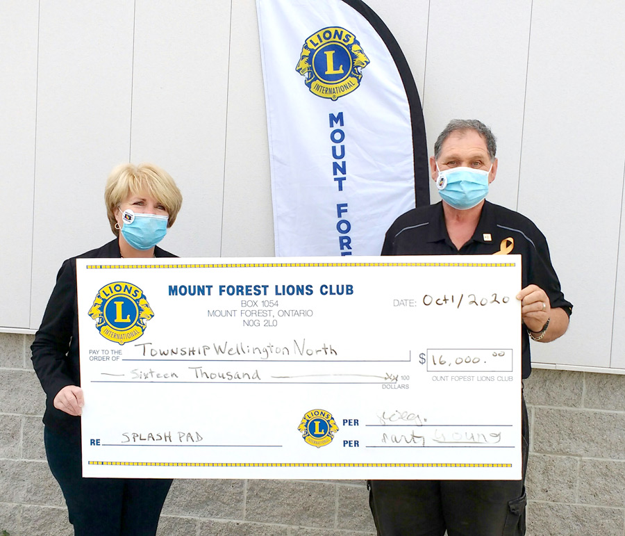 Splash Pad contribution – Mount Forest Lions president Marty Young presented Wellington North councillor Sherry Burke with a $16,000 cheque for the Mount Forest Splash Pad recently. This is the final payment on the Lions Club’s commitment of $50,000 toward the construction of the facility. COVID-19 restrictions have prevented an official opening ceremony, but many children enjoyed the splash pad this summer, noted club officials, who thanked the community for the support in fundraising for the project.