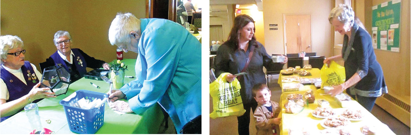 The Auxiliary to Louise Marshall Hospital in Mount Forest held its annual spring luncheon fundraiser on May 3. LEFT: Doris French, right, fills in a ballot for the glass terrarium succulent planter, the door prize being awarded to an attendee. Auxiliary secretary Wreatha Speers holds up the prize while fellow auxiliary member Iris Cox looks on. RIGHT: Auxiliary member Jan Johnson, right, bags up some goodies purchased by Cindy Vanbruchem at the table laden with baked goods, all made and donated by hospital auxiliary members and friends. Three-year-old Jack Stone approves. Johnson was assisted at the bake table by Carla Smith at the auxiliary’s spring luncheon. Photos by Lynne Turner