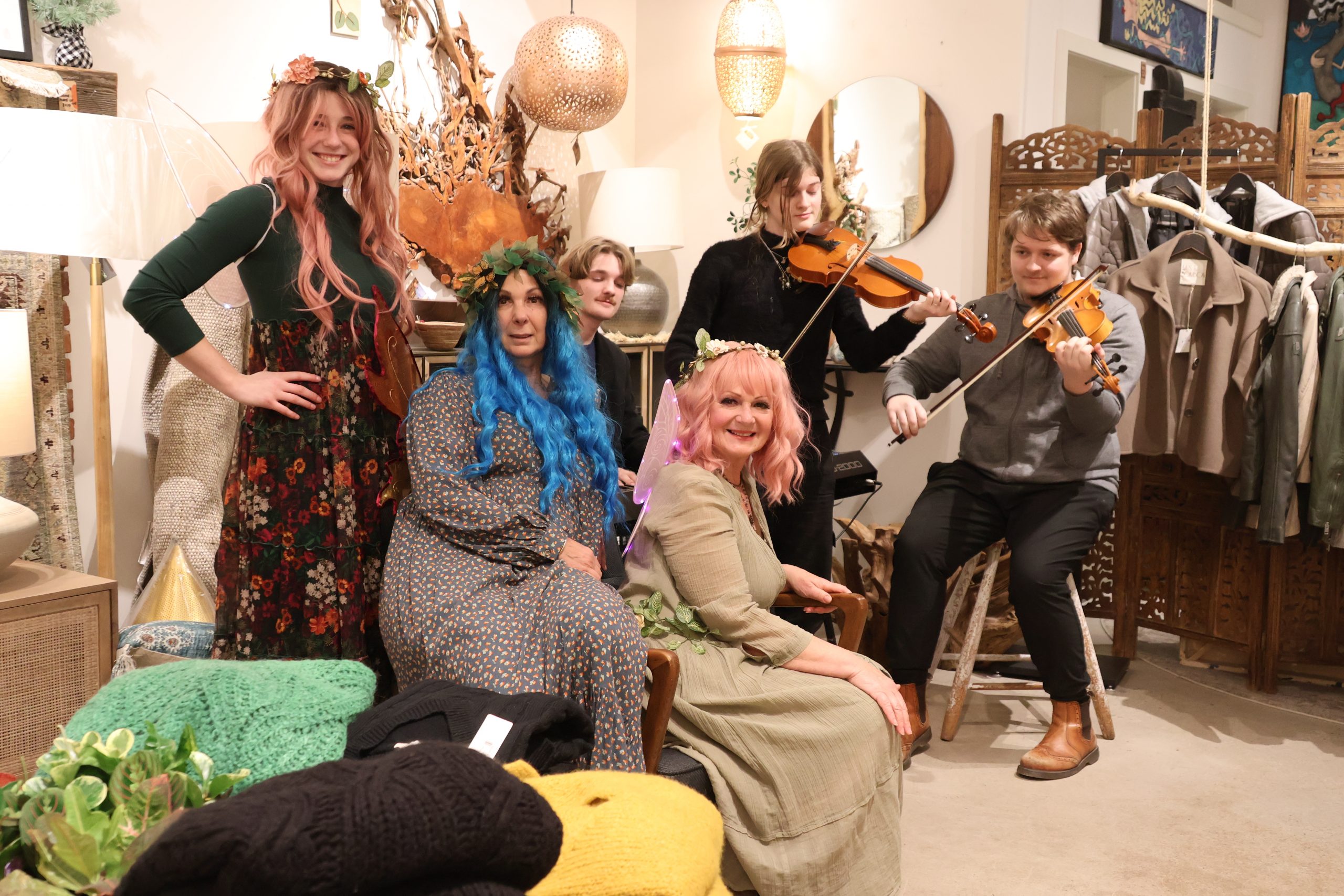 From left, “fairy helpers” Skylar Vos and Edna Chiprout, Karger owner Renate Karger, and local musicians The Quelleys at Karger during the Starlight Shopping event on November 24. Photo by Duncan Hossack