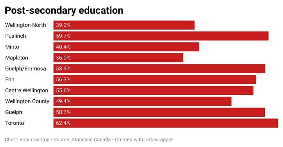 Mapleton and Wellington North are home to the smallest percentage of post-secondary graduates, at 36% and 39% respectively.