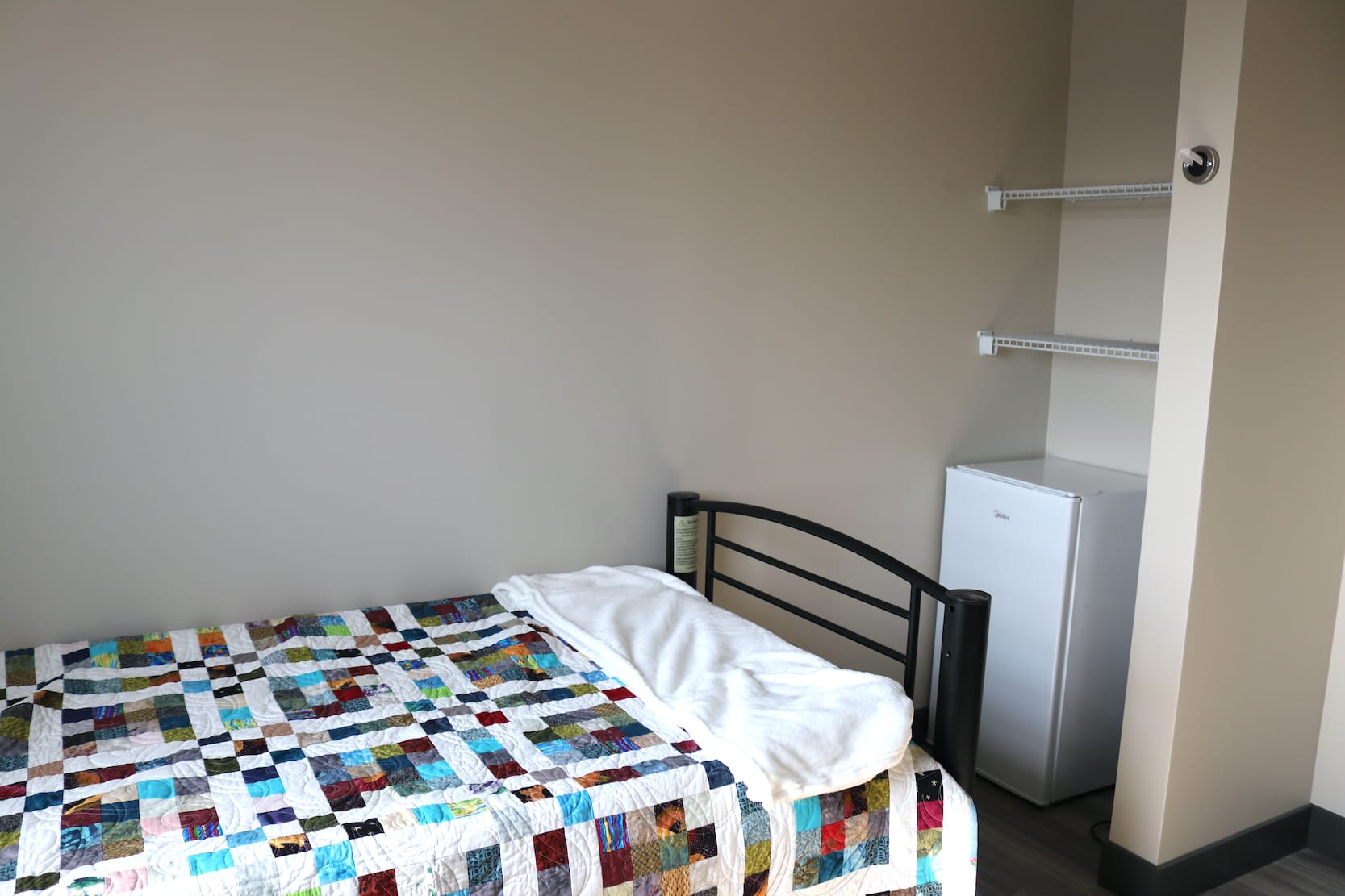 Third-floor units include a bed, small fridge, bedside table and an area to hang clothes.