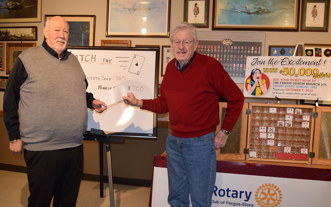 Jim Dixon, left, was the weekly winner in the Jan. 20 Catch the Ace draw run by the Rotary Club of Fergus-Elora. He received $590 from Jim Gibbons, chairman for the raffle. All net proceeds from this Catch the Ace raffle will go to Groves Hospital Foundation for the new hospital. None of the weekly winners so far has chosen the envelope with the Ace of Spades card, so the overall jackpot continues to climb. The jackpot for the Feb. 3 draw will be $11,803 if all 800 tickets for that date are sold. Tickets are $5, available at the Legion branch, 500 Blair Street in Fergus. Submitted photo