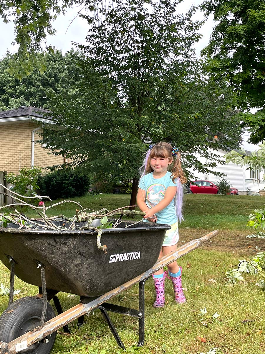 Four year-old Gracyn Soules of Elora helped clear debris in her grandmother’s Elora neighbourhood on Aug. 4. Her grandmother, Lisa Tavenor, said gathering twigs and branches for neighbours, some of whom were away at the time, is teaching Gracyn about gestures of kindness. But for this little helper, it helped to know there were treats to follow.