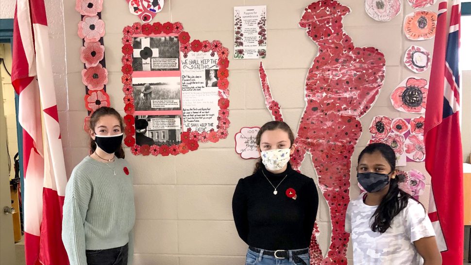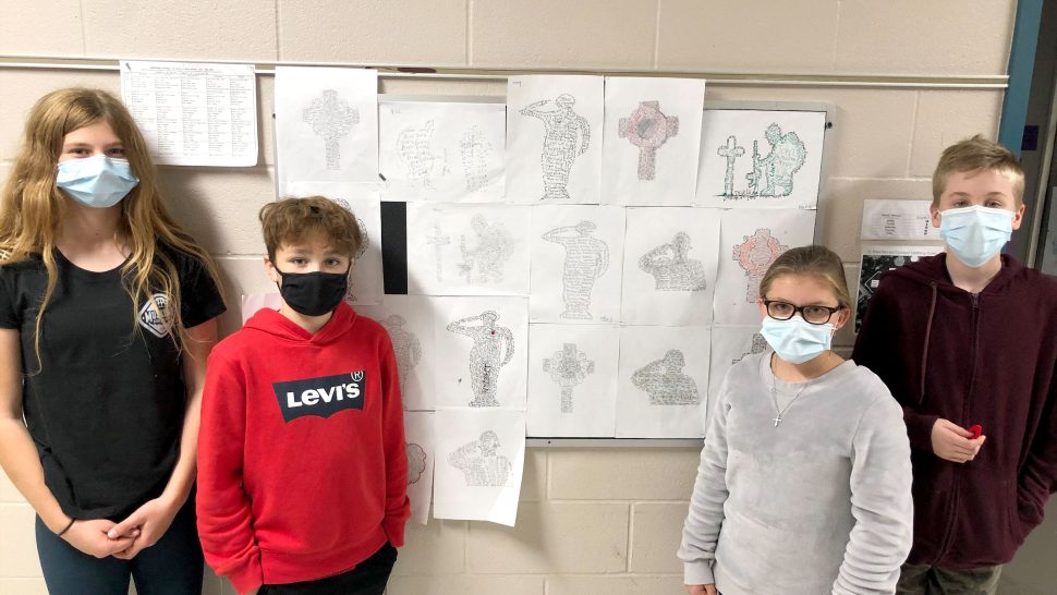 Newspaper, cardboard and paper posters decorated with poppies lined the halls of St. Mary Catholic School for Remembrance Day.