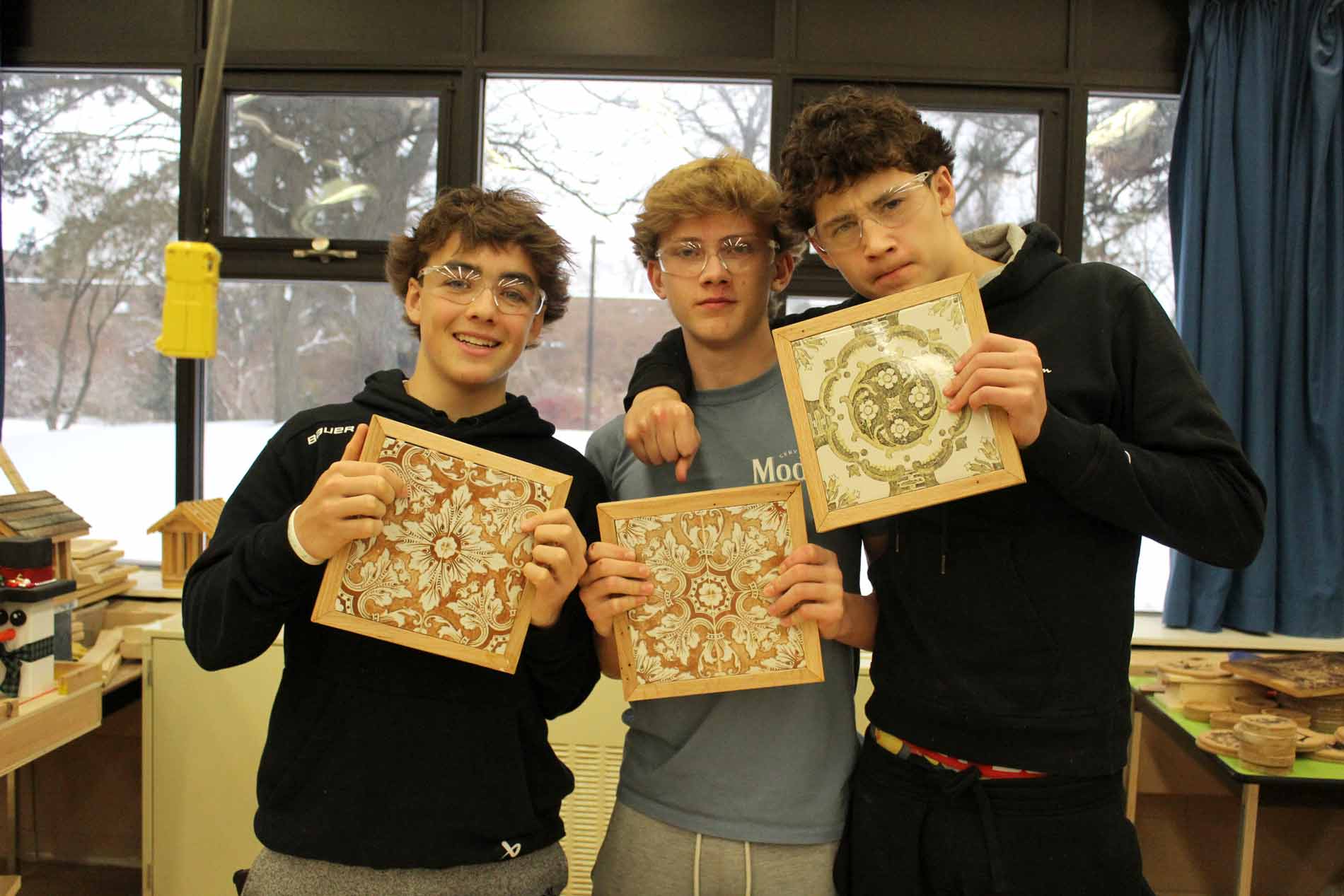 Avery Smith, Nick Wilton and Johnson Dunlop hold up the tiles they secured frames to during a construction lesson. Smith lives in Guelph/Eramosa and attends GCVI and Wilton and Dunlop live in Puslinch and attend John. F. Ross. Dunlop said he signed up for the tech day at College Heights because it was an opportunity to learn skills that would be useful in life, empowering him to know how to complete projects himself rather than always needing to hire someone.