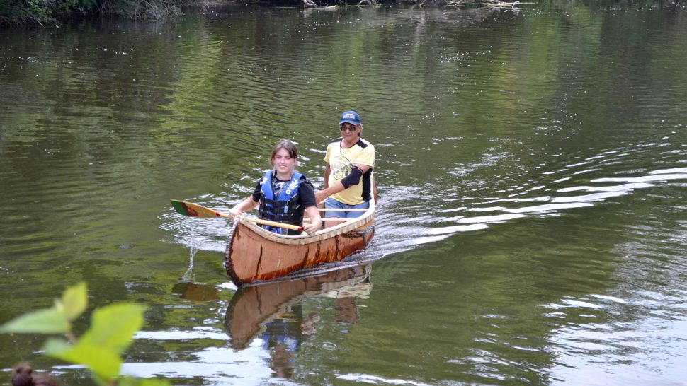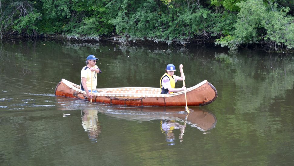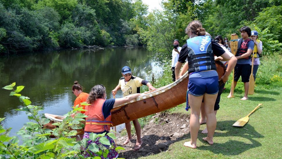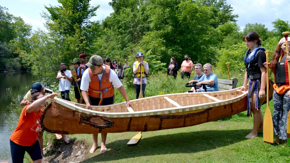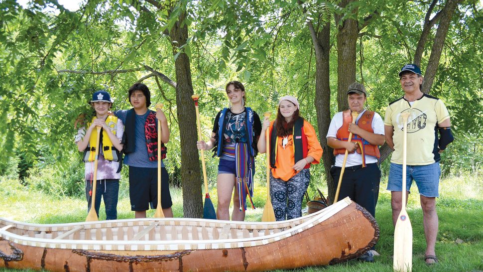 Canoe launch – With direction from birch bark canoe builder Chuck Commanda, five students from the Upper Grand District School Board built a canoe from scratch.
