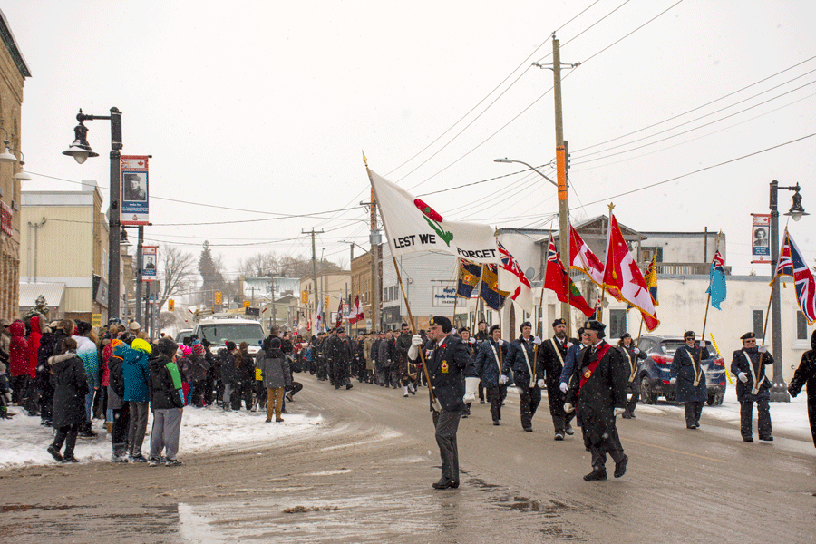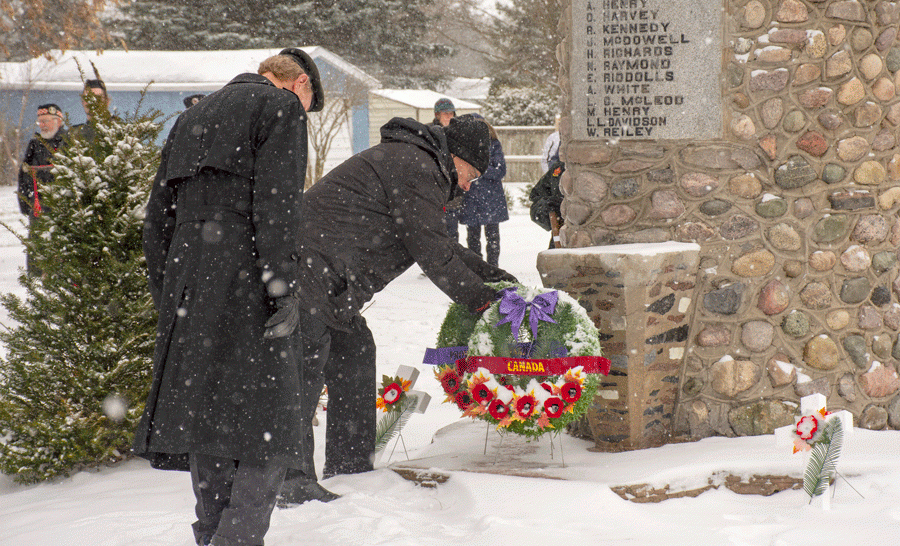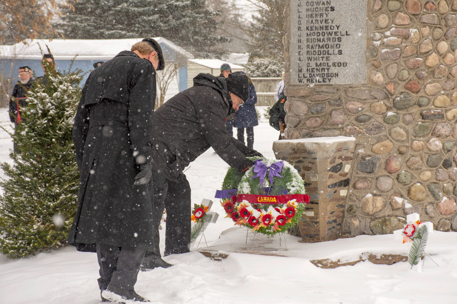Drayton Remembers – Local students Alexis Skerritt and Lilly Sprague read In Flanders Fields at the Mapleton Remembrance Day service on Nov. 11 at the Drayton cenotaph. Portions of Main Street and Wellington Street (Wellington Road 11) were shut down for the parade.