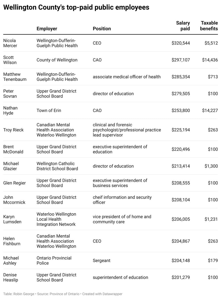 In Wellington County, the public employee bringing home the largest salary is once again Wellington-Dufferin-Guelph Public Health (WDGPH) CEO Dr. Nicola Mercer, with a salary of over $320,000.