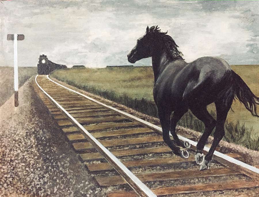 First it showcases horse drawings of Leonardo da Vinci. Then it moves on the famous 18th century horse portraitist, George Stubbs, and then to Alex Colville, including an analysis of his iconic painting, Horse and Train.