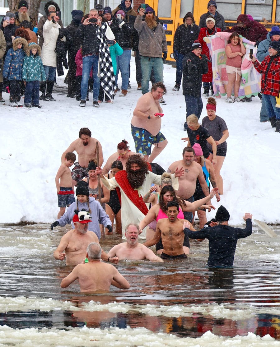 GRAND VALLEY – A snowy gale from the west producing wind chills of -18C greeted the intrepid participants in the 34th Grand Valley Lions Club Polar Bear Dip on Jan. 4. The event was rescheduled from New Year’s Day due to dangerously high water levels. Large chunks of ice floated down the Grand River as young and old took the plunge into water at a bone chilling +2C.