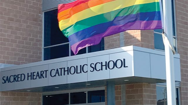 Catholic pride – Grade 8 student Ava McBurney raised the Pride flag on June 1 at Sacred Heart…
