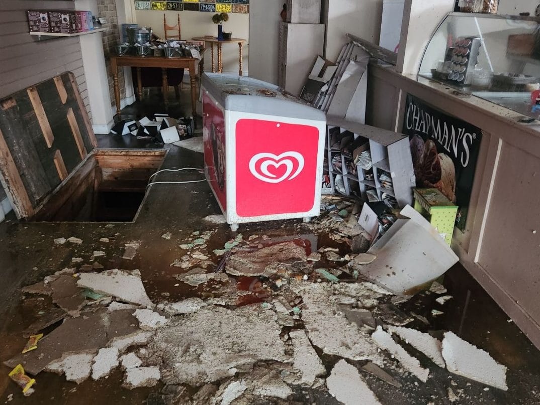 The ceiling above the ice cream shop became saturated by water, with portions collapsing into the store.