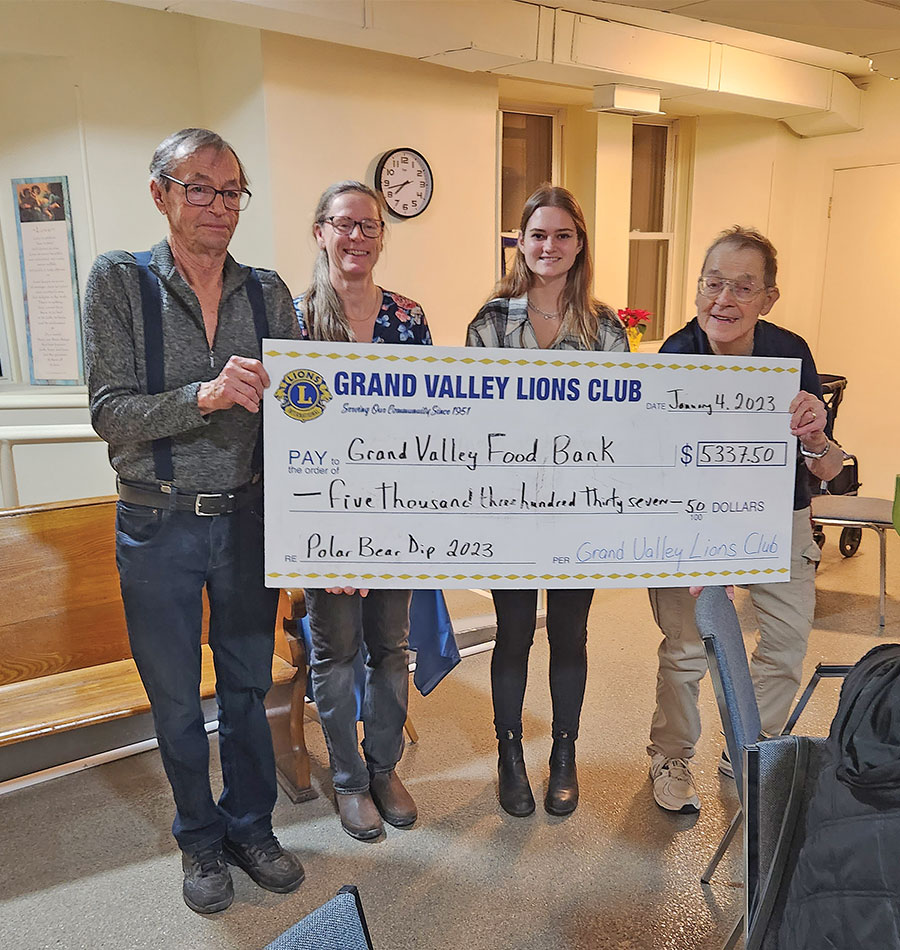 Chilly dip – Fourty-eight people took a chilly dip to start off the new year. The Grand Valley Lions Polar Bear Dip raised $5,337 for the Grand Valley Food Bank and over 200 spectators donated around 300 pounds of food. Attridge Transportation provided two buses for the dippers for changing into warm clothing. Lions  Club members John Ince and Jim Shaw presented a cheque to Verena Tupling, accompanied by Chase Rogers.
