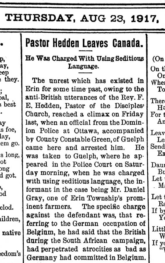 Despite later denying the comments, Pastor Frederick E. Hedden, a conscientious objector, was arrested by the Dominion Police and hauled off to Guelph to face a charge of sedition. The crown dropped the charge on the condition that Hedden return to the U.S. for the duration of the war.