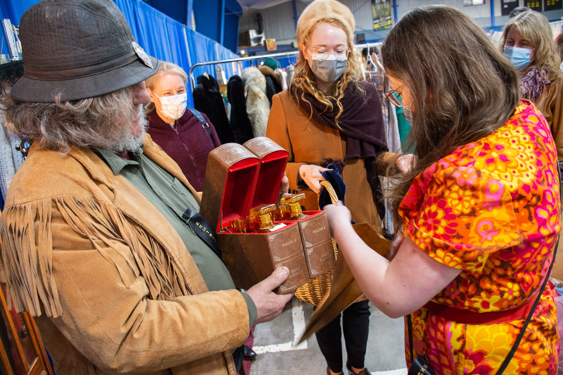 Speaking with a sharp whistle, Dodge tells a woman eyeing a blue, vintage hat, “We base things on what we pay.”