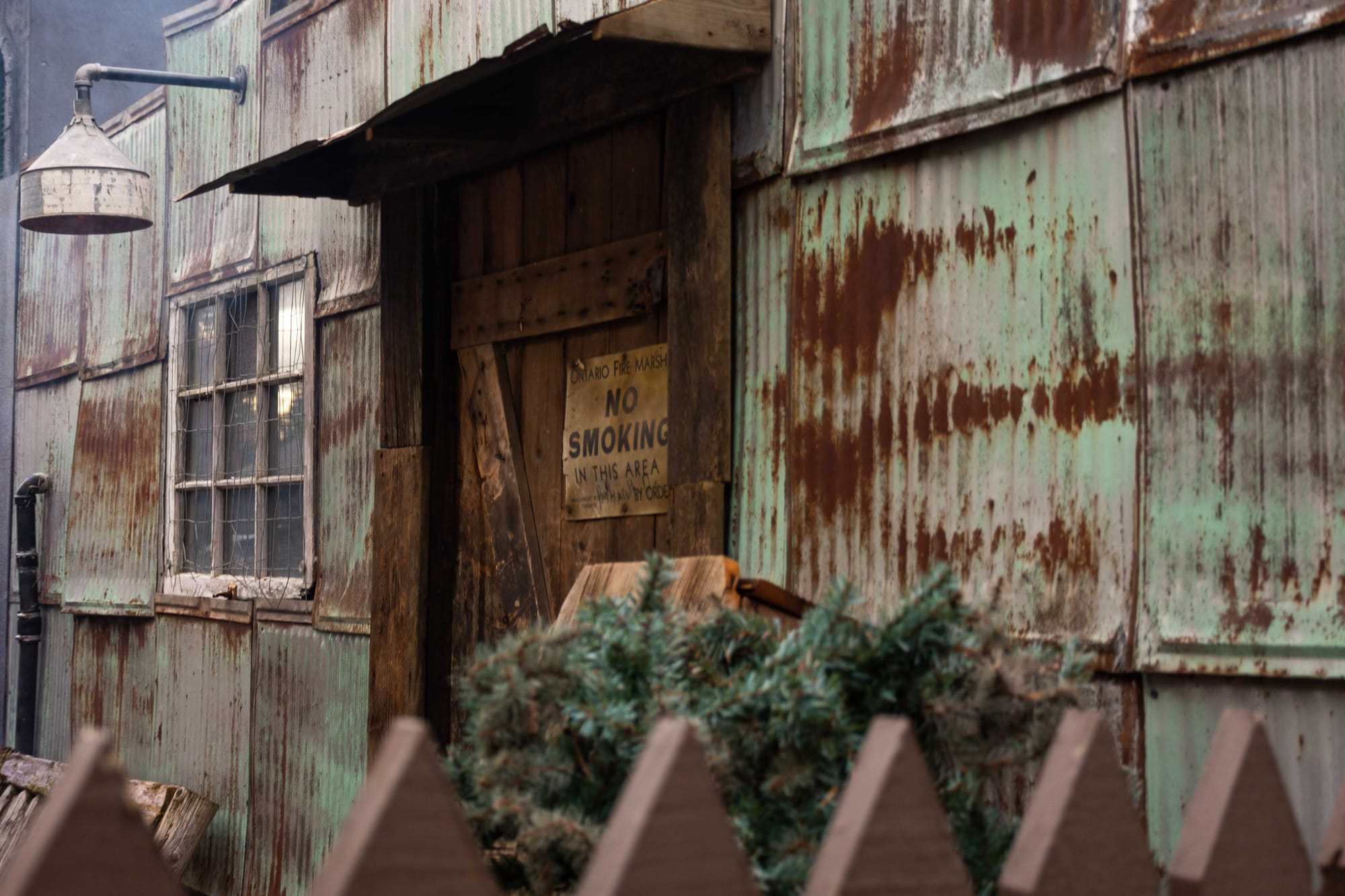 “We’ve been going at this since mid-August,” he says of the installation, which includes antique signs, metal roofing, and wooden beams for a realistic look.