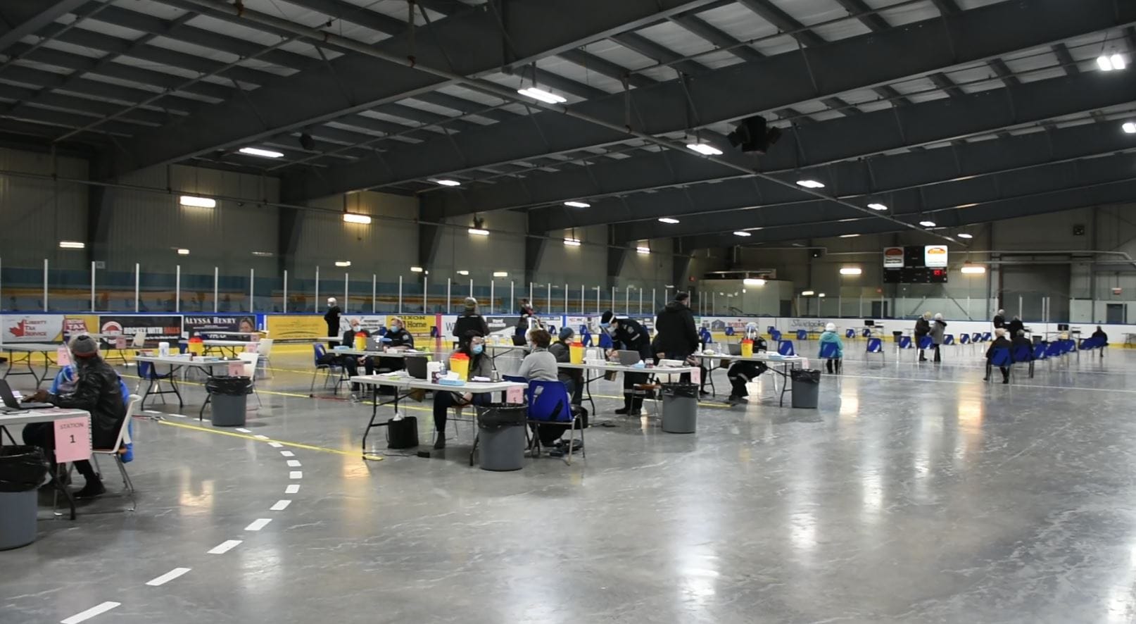 The ice is off Pad B and dozens of tables were set up on the rink pad. Each table had a trained public health nurse to administer shots.